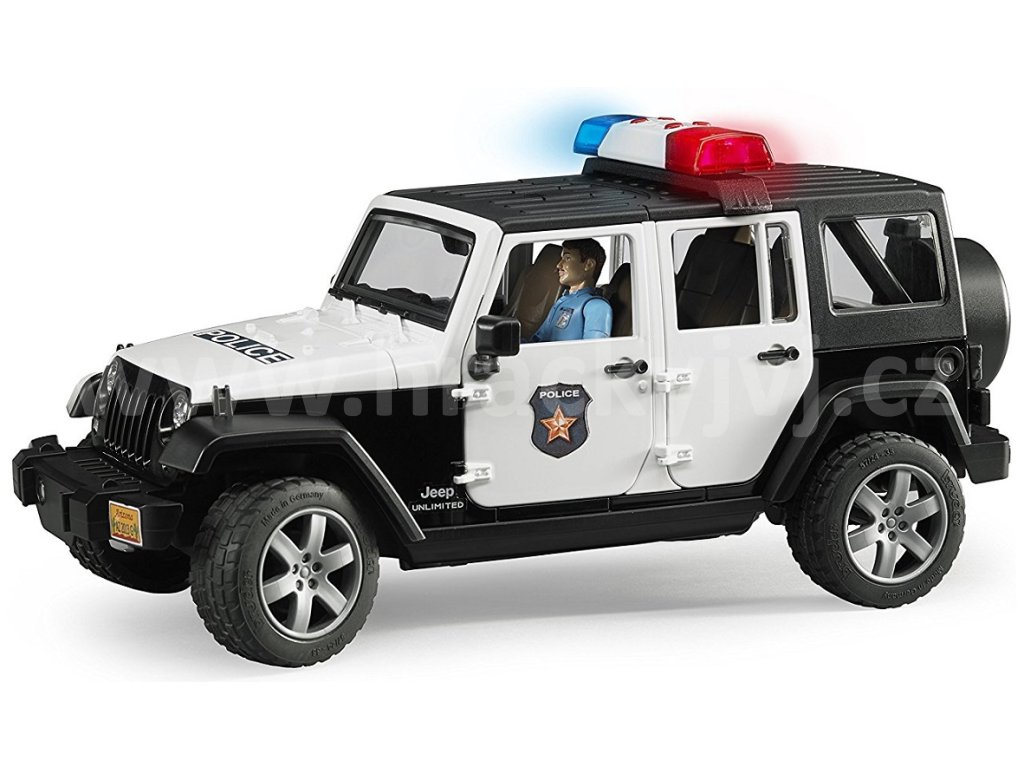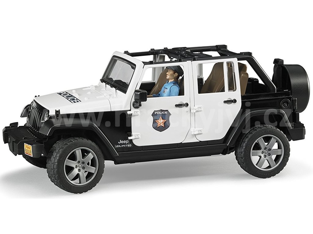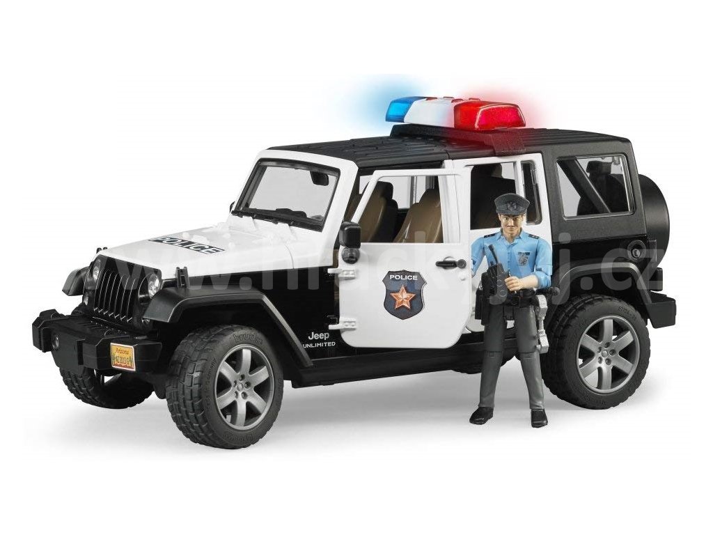 Bruder Jeep Wrangler Rubicon Policie s figurkou je novinkou roku 2015. Bruder Jeep Wrangler Rubicon je věrnou kopií opravdového Jeepu s velmi detailně propracovaným modelem motoru a z části zasklenou kabinou řidiče. Jeep má sundavací dvoudílnou střechu, odnímatelná zadní sedadla a odpruženou přední i zadní nápravu. Lze jej řídit pomocí přídavného volantu s delším ramenem, který se zasune do stávajícího volantu a tím se velmi usnadňuje ovládání vozu. Má otvíratelné všechny boční i zadní dveře a kapotu - lze nahlédnout na blok motoru. Součástí vozu je figurka policisty v uniformě, kterému nechybí opasek s obuškem, pistole, baterka, pouta a vysílačka. Jeep Wrangler Rubicon disponuje univerzálním funkčním majákem se 4 zvuky - zvuk motoru, policejní sirény, sirény hasičů a tónem výstrahy. Kompatibilní s figurkami Bworld.