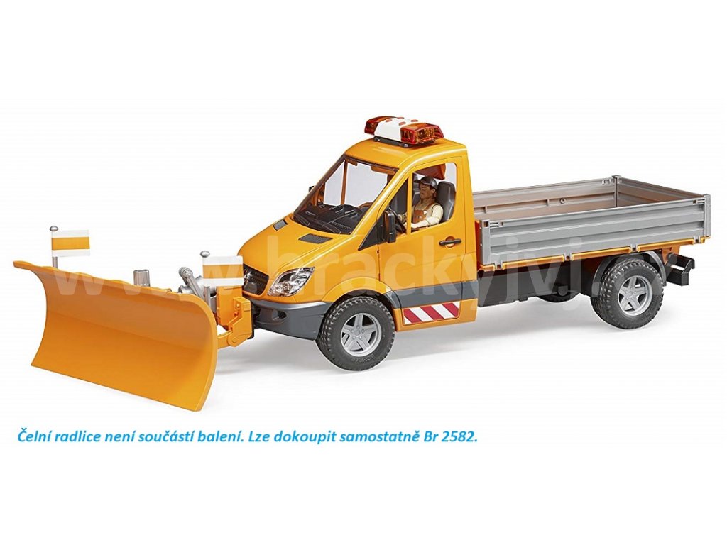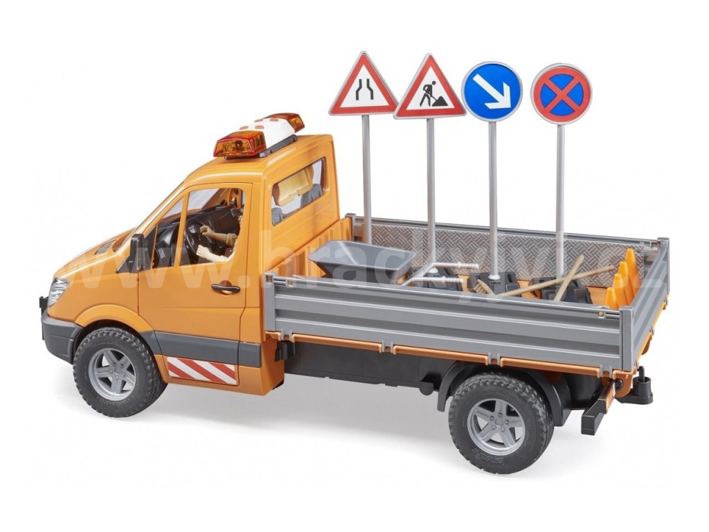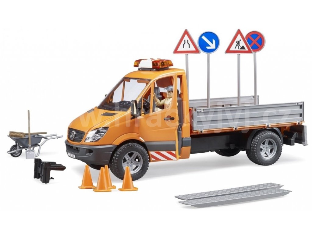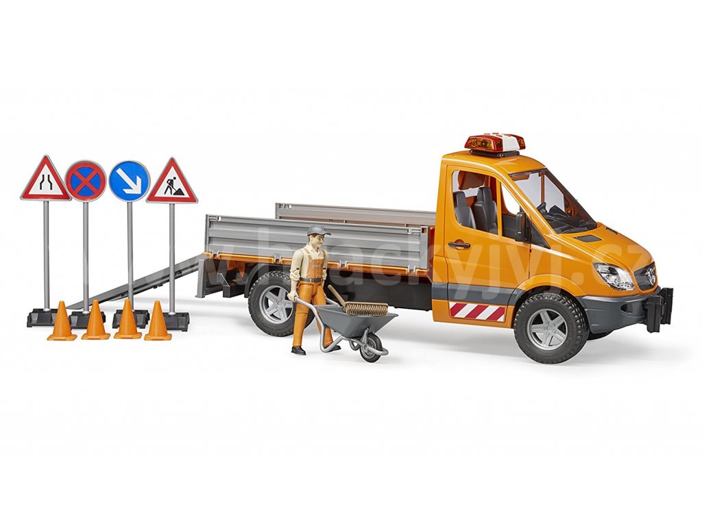 Bruder MERCEDES BENZ Sprinter komunální má moderní design a propracované detaily. Obsahuje dvě nájezdové plošinky, možnost vyklopení korby, odpojitelné bočnice (3 ks), dveře kabiny se dají otevřít a okna jsou vyrobena z vysoce kvalitního polykarbonátu. Součástí vozu je figurka komunálního pracovníka, který je pro práci vybaven kolečkem, lopatou a koštětem. Sada navíc obsahuje dopravní značky a kužely. MB Sprinter je vybaven světelným a zvukovým majákem.