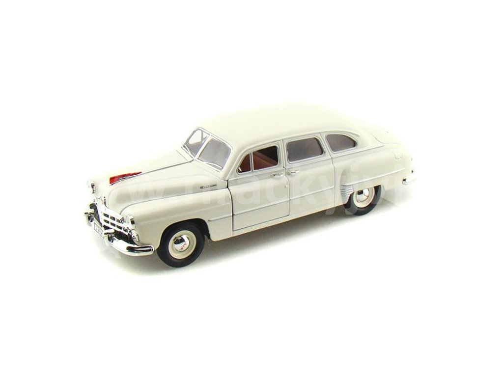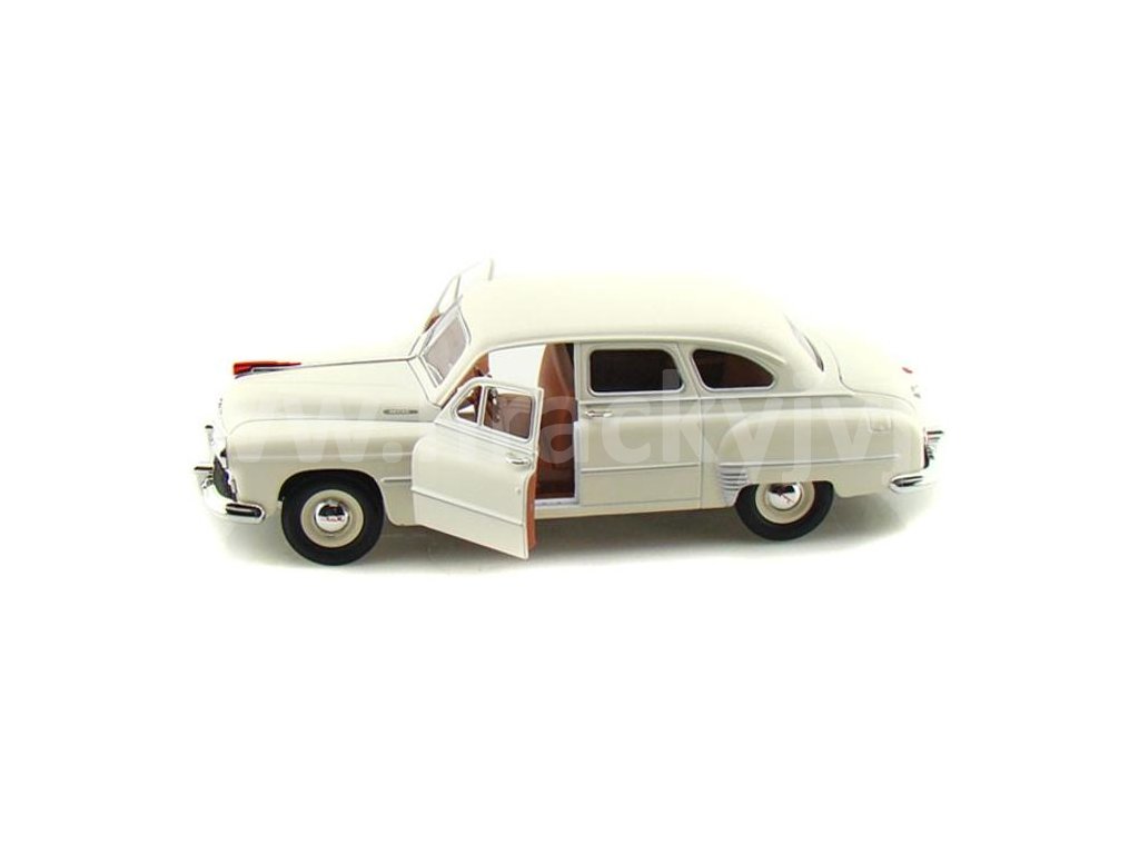 Kovový model GAZ -12 ZIM 1950 bílý, s plastovými díly. Otevírací dveře. Délka vozu 21 cm. Model je v papírové krabičce s fóliovým průhledem.