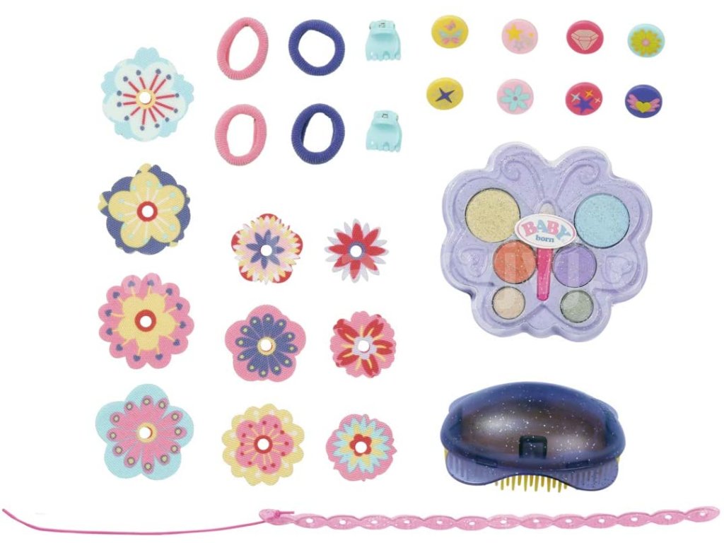 Make-up, vytváření účesů a květinových stylů… Tvářička tak krásná, jako je tato nepotřebuje žádné vylepšení, ale přeci jenom… i krásné věci mohou být ještě krásnější. Mladé stylistky dokážou na této 27 cm velké panence vykouzlit úžasné účesy. Od divokých barevných melírů na večírek až po romantické zapletení do divadla. Díky praktickému kartáči a gumičkám do vlasů se mohou heboučké a pevné vlasy česat znovu a znovu. Čelenka s vyměnitelnými květinovými ozdobami se stane součástí každého účesu. Barevná paleta a třpytivé doplňky povzbuzují malé make-upové umělce k experimentování a jsou vhodné i pro pleť dětí. A aby celkový dojem byl dokonalý, jsou k dispozici i barevné sponky (skřipce), aby vše hezky a dokonale ladilo.