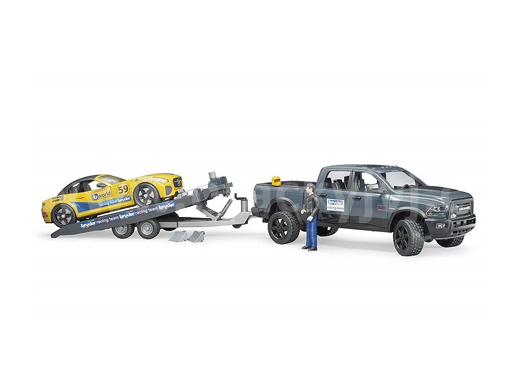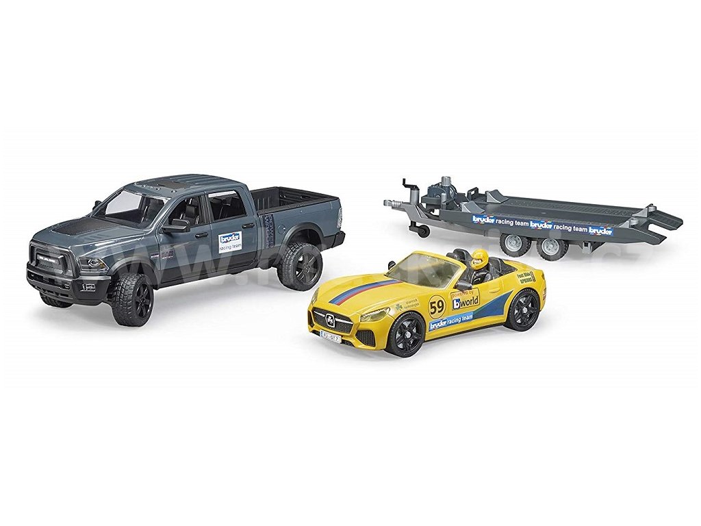 Obohaťte svou sbírku modelů BRUDER tímto parádním setem RAM Roadster Racing Team. Terénní auto RAM Power Wagon je robustní model vybaven čtyřdveřovou kabinou s otevíratelnými dveřmi, do které můžete usadit až 4 figurky Bworld. Pro snadné zdolání obtížného terénu má RAM odpružené nápravy. Pomocí prodlouženého volantu můžete jednoduše řídit. Dveře zavazadlového prostoru se dají jednoduše otevřít pro snadné naložení nákladu, jako jsou palety, přepravní boxy nebo můžete převážet hranaté balíky slámy. Součástí modelu je vlek pro přepravu parádního žlutého závoďáku se sundavací střechou a figurka řidiče.