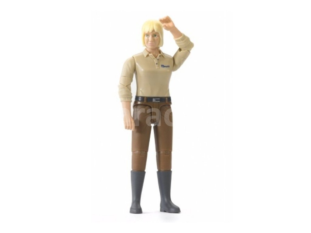 Bruder Bworld figurka ženy - světlé vlasy, vysoké boty, má pohyblivé končetiny, pohyblivou hlavu, ruce uzpůsobené k uchycení předmětů, např. volantu vozidla. Postavy působí velmi realistickým dojmem. Výška figurky je 11 cm. Barevné provedení figurky odpovídá obrázku.