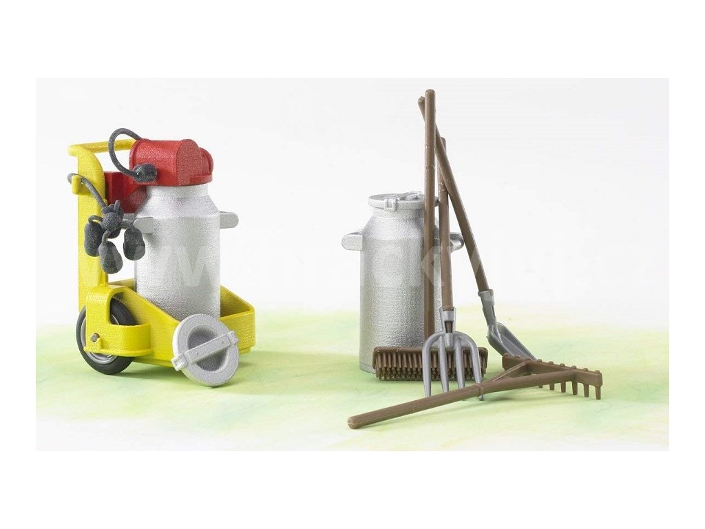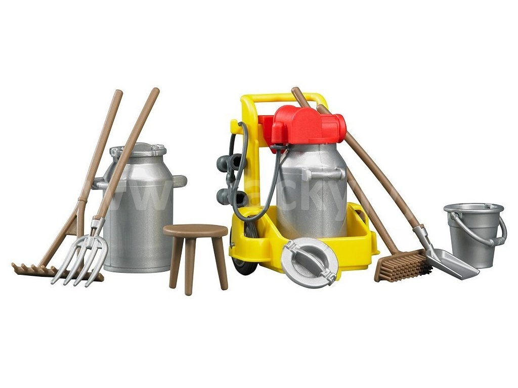 Chovatelská sada pro dojení kraviček obsahuje 2 konve, vozík s dojící soupravou, dojící stoličku a úklidové nářadí - lopata, vidle, hrábě, koště a kbelík. Tento set je kompatibilní s figurkami Bworld a neobsahuje kravičku, která je vyobrazena pouze pro ilustraci.