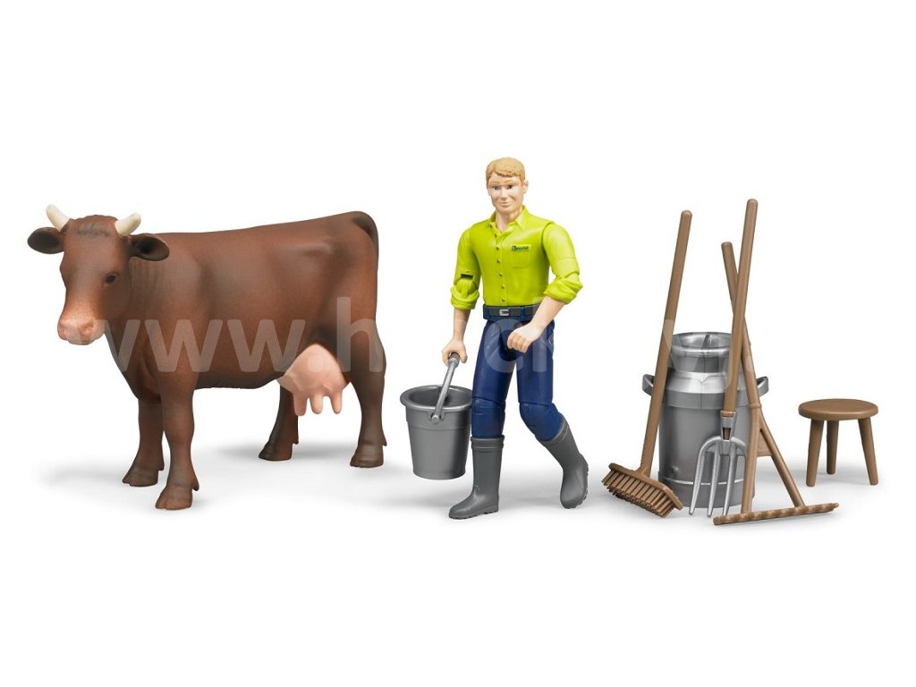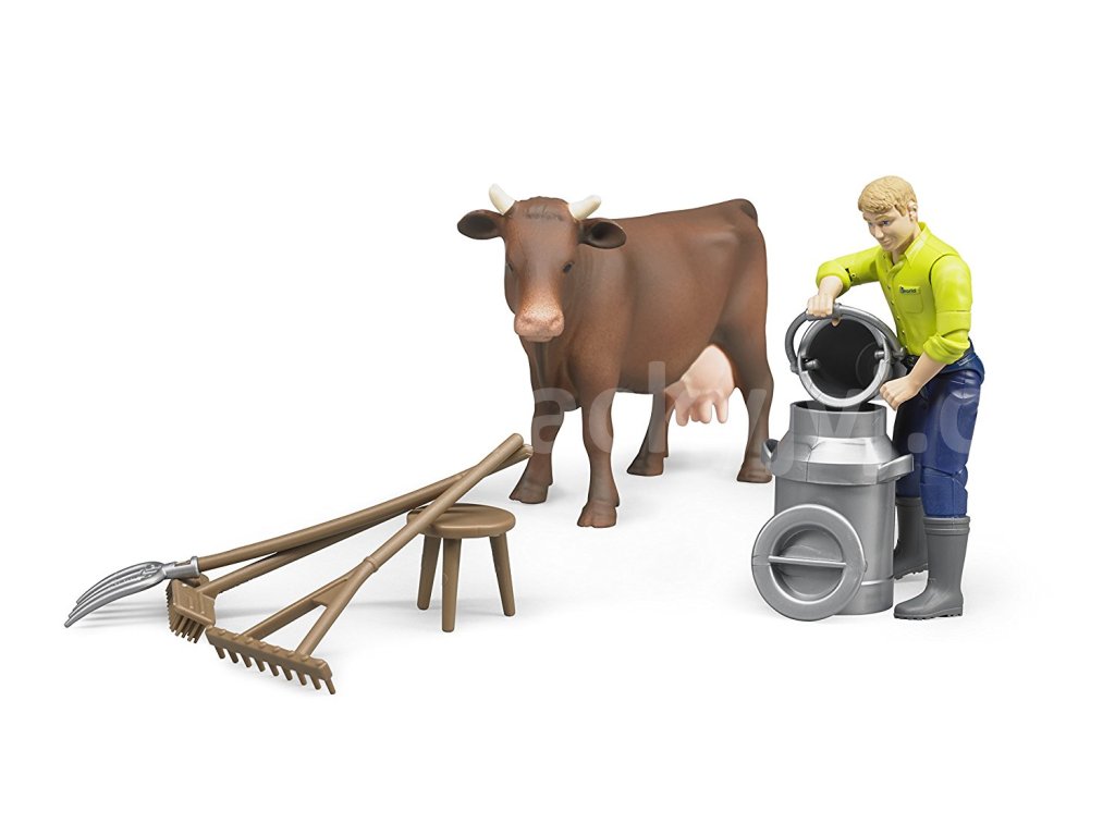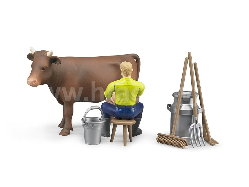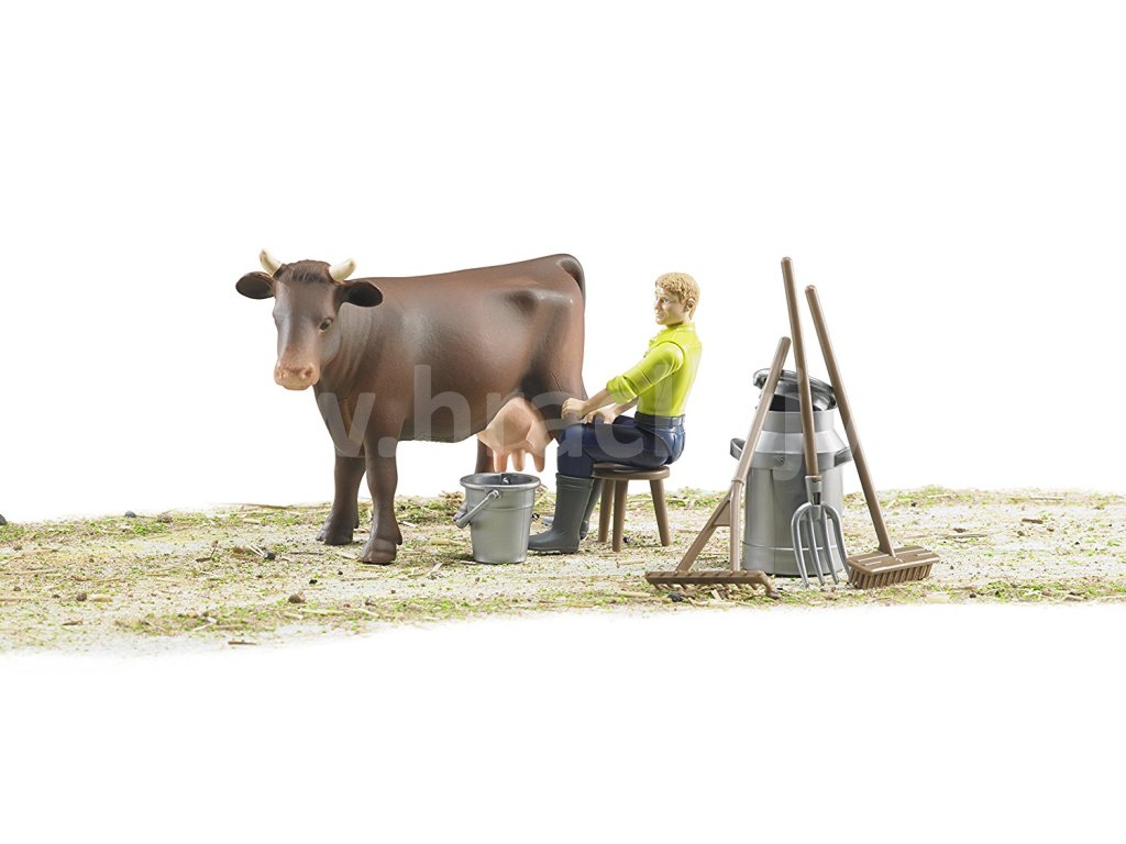 Tento set obsahuje figurku kravičky, dojící zařízení, figurku muže s pohyblivými končetinami a hlavou, který může uchopit různé předměty či příslušenství. Součástí této sady je konvice na mléko, kbelík a úklidové nářadí - vidle, hrábě, koště a dojící stolička. Výška figurky je 11 cm a délka krávy 18 cm. Kompatibilní s figurkami Bworld.