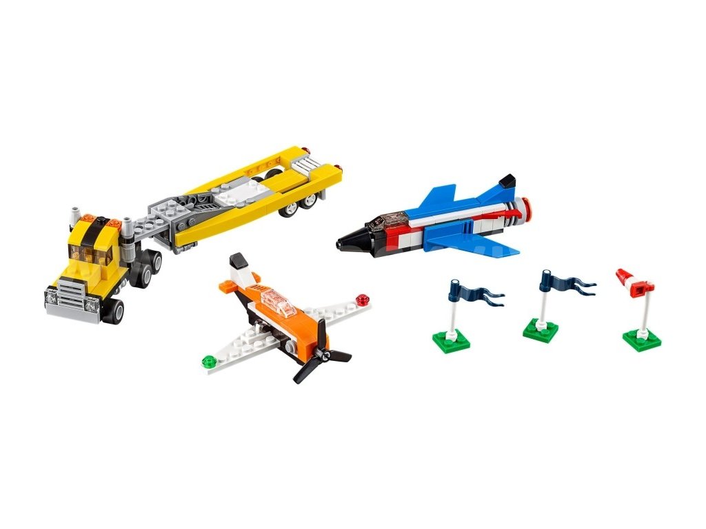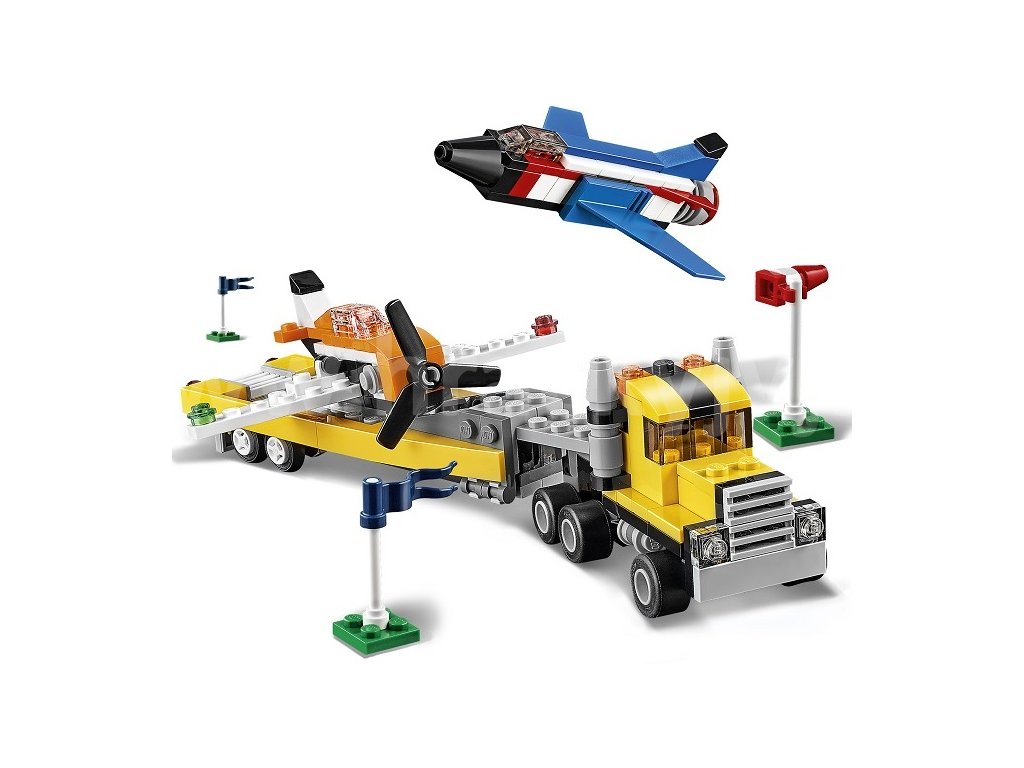 Užij si krásný den na letecké show s touto úžasnou sadou, která obsahuje stíhačku, vrtulové letadlo se skládacími křídly a transportní nákladní vůz s odpojitelným přívěsem, navíc dvě sestavitelné vlajky a sestavitelný větrný rukáv. Sadu LEGO® Creator 3 v 1 tvoří tři modulární části, které umožňují rychlou přestavbu modelu, a lze ji zkombinovat s mini modulárními vozidly 31054 a 31055 LEGO Creator - můžeš si tak vytvořit nová vozidla a užít si ještě více zábavy při hraní. Lze přestavit na Stavební vůz nebo na dvě Závodní auta.