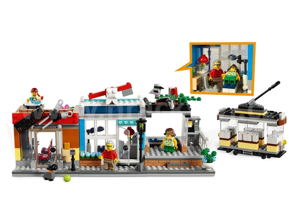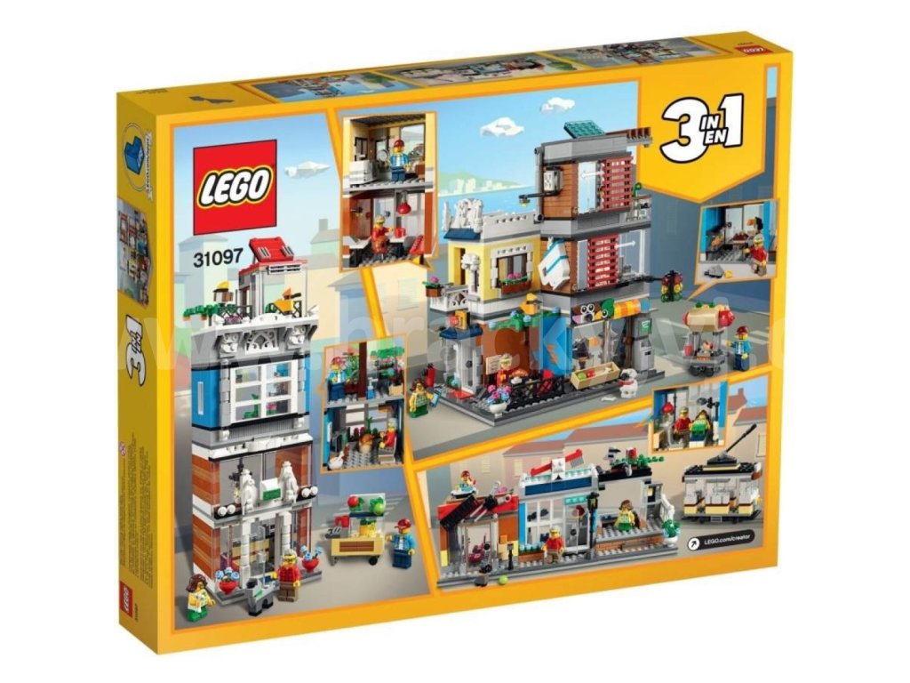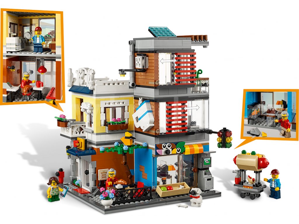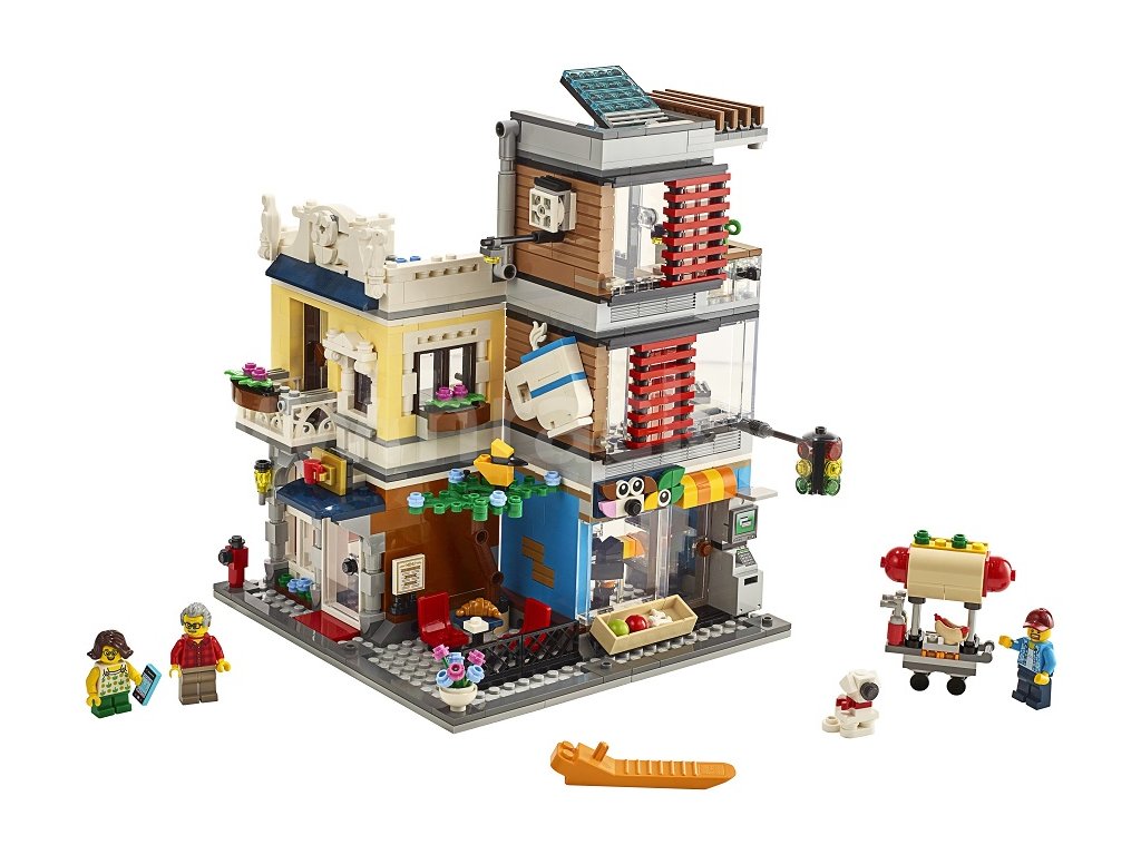 Rozjeď si své podnikání a otevři si zverimex nebo kavárnu. V kuchyni v horním patře napeč nějaké lahodné croissanty a o patro níž s nimi můžeš obsloužit hladové zákazníky v kavárně a na venkovním posezení. V sousedním zverimexu se můžeš starat o rybičky, tukana, roztomilého pejska a myšku. Pak jdi o patro výš a dopřej si relax v bytě s pohovkou a televizí a nebo se vydej do nejvyššího patra s ložnicí a balkonem. Potom vyber peníze z bankomatu a dopřej si vynikající párek v rohlíku v blízkém stánku. Celý model domu můžeš přestavovat, jak jen budeš chtít. Až si budeš chtít užít zcela nové dobrodružství, můžeš dům přeskládat na několikapatrovou banku nebo na tržiště s tramvají! Součástí sady jsou 3 minifigurky, které jsou připravené na spoustu zábavy a dobrodružství v centru města.