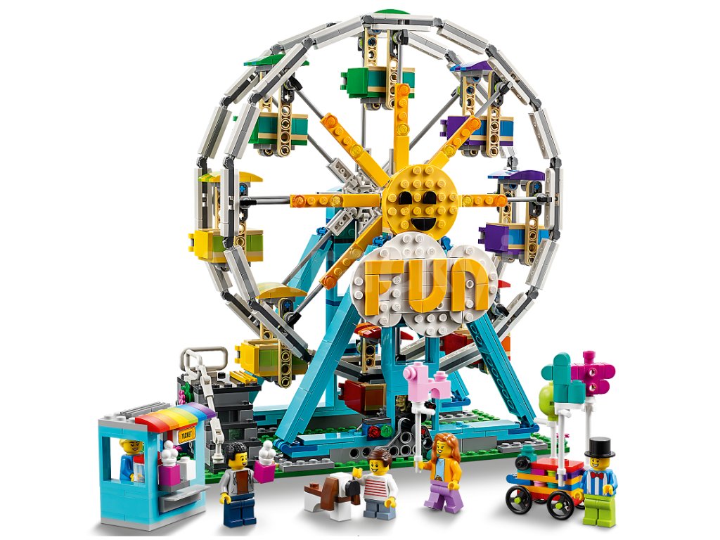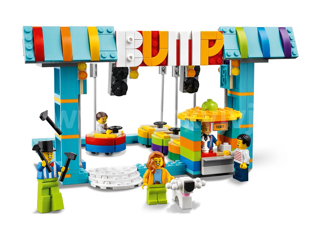 • Otočné ruské kolo je osazeno 8 kabinami, do kterých je možné umístit minifigurky. Dále nechybí pokladna, stánek s balónky a psí kamarád z kostek.