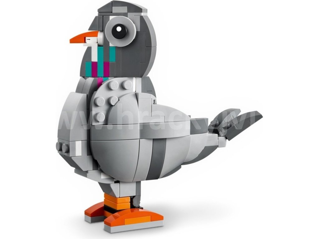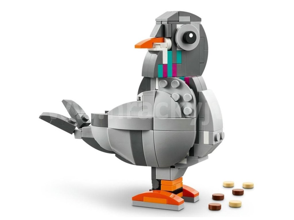 Představujeme vám perfektní stavebnici LEGO® pro milovníky domácích mazlíčků! Postavte si nezbednou kočku, která si hraje s klubíčkem a myškou a pak se nají z misky. Model pak přestavte na roztomilého pejska, který žvýká kost, nebo na zvědavého holuba s otáčející se hlavou, který rád klove drobky. S touto úžasnou stavebnicí 3 v 1 zábava nikdy neskončí!
