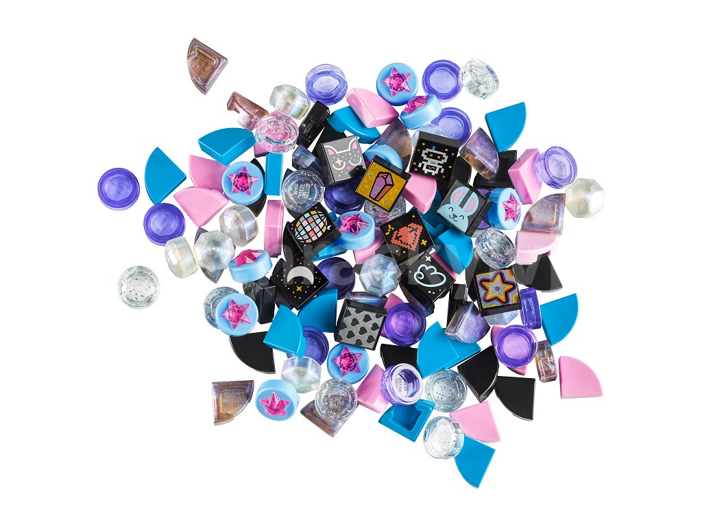 Rozjasněte svůj svět s tímto třpytivým sáčkem doplňků DOTS! Vymýšlejte neomezené kombinace - Uvnitř sáčku se ukrývá 105 barevných dílků, včetně barevných, duhových, třpytivých zdobítek a také zdobítek s 3D efektem hvězdy. Dále nechybí 10 z 16 dílků s grafickým potiskem, které pokrývají různé zájmy, jako je hudba, láska, zvířata a vesmír. Zkrášlete si svět podle sebe! Které dílky jste v krabici našli vy?