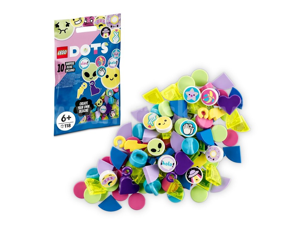 Odvažte se, dejte průchod své kreativitě a vytvářejte s DOTS doplňky takové vzory, jaké vás jen napadnou! Vymýšlejte neomezené kombinace s pomocí barevných dílků, 10 náhodných zdobených dílků a ozdob ve tvaru srdíček a blesků. Použijte je spolu s ostatními přizpůsobitelnými sadami LEGO® DOTS nebo a pusťte ke slovu své kreativní já. Ať už se rozhodnete pro jakýkoli způsob zdobení, nemůžete se splést! Které dílky jste v krabici našli vy?