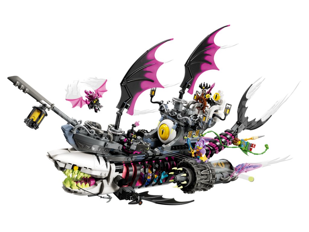 Noční lovec využil svých schopností tvoření snů a zajal Izziina oblíbeného plyšáka, kterého spojil s pirátskou lodí a vytvořil strašidelnou nemrtvou Žraločkoloď. Nyní se můžete vydat do Světa snů v této parádní stavebnici LEGO® DREAMZzz™ a postavit tuto děsivou loď. Když vyberete variantu lodě, přistavíte jí silné motory a plachty, zatímco varianta tanku si žádá parádní doplňky a létající oči.