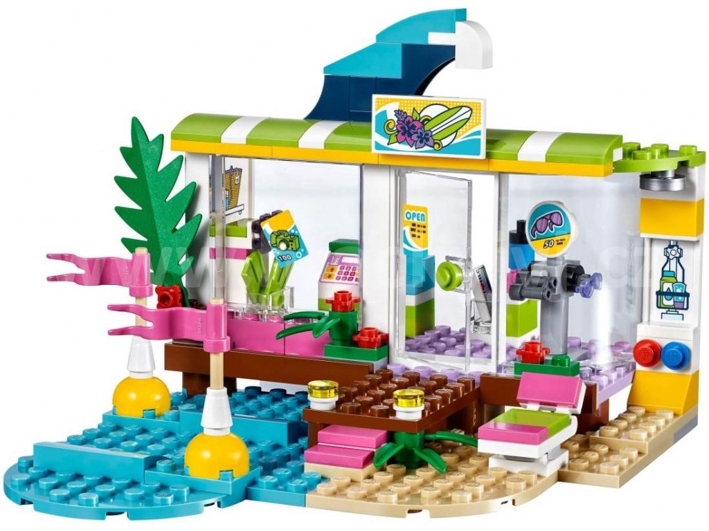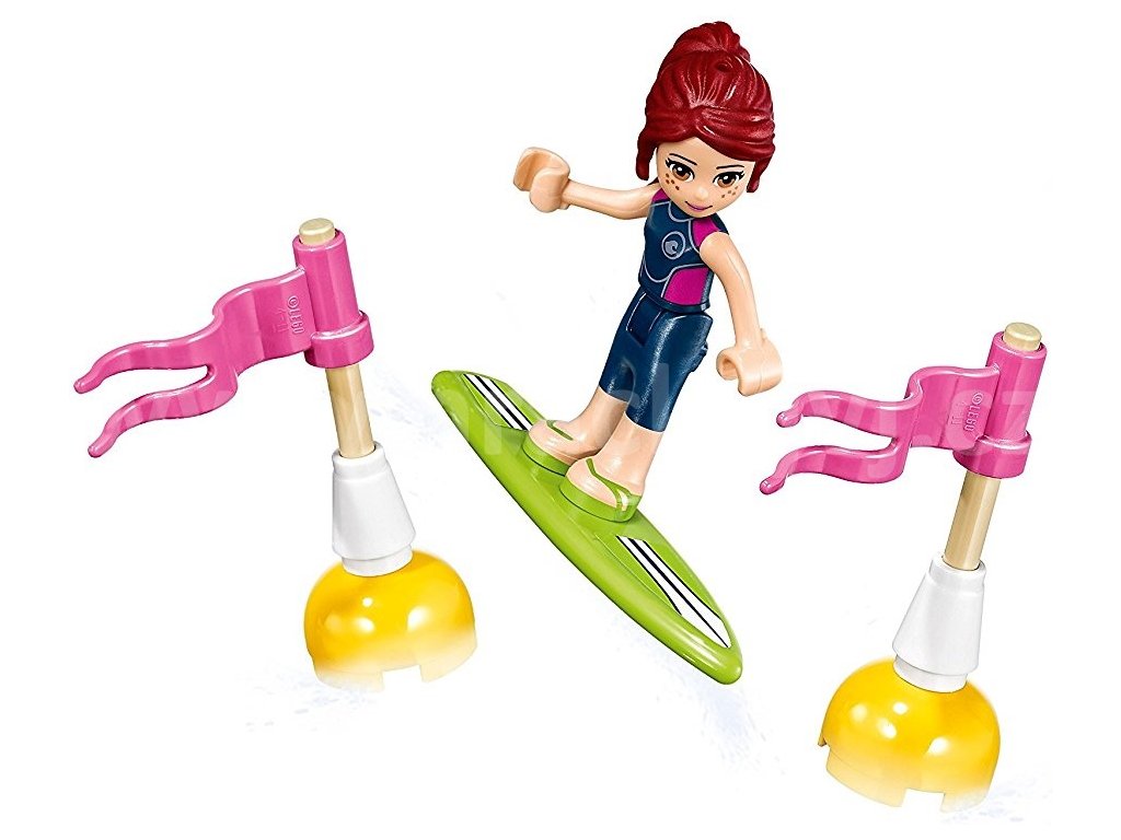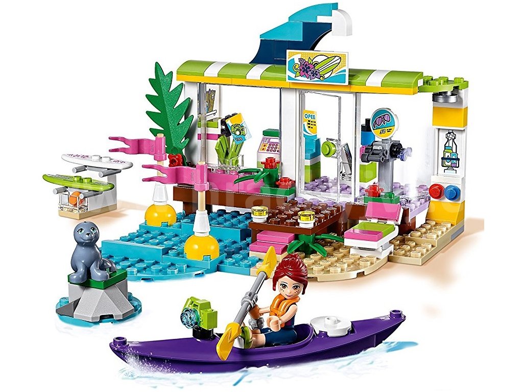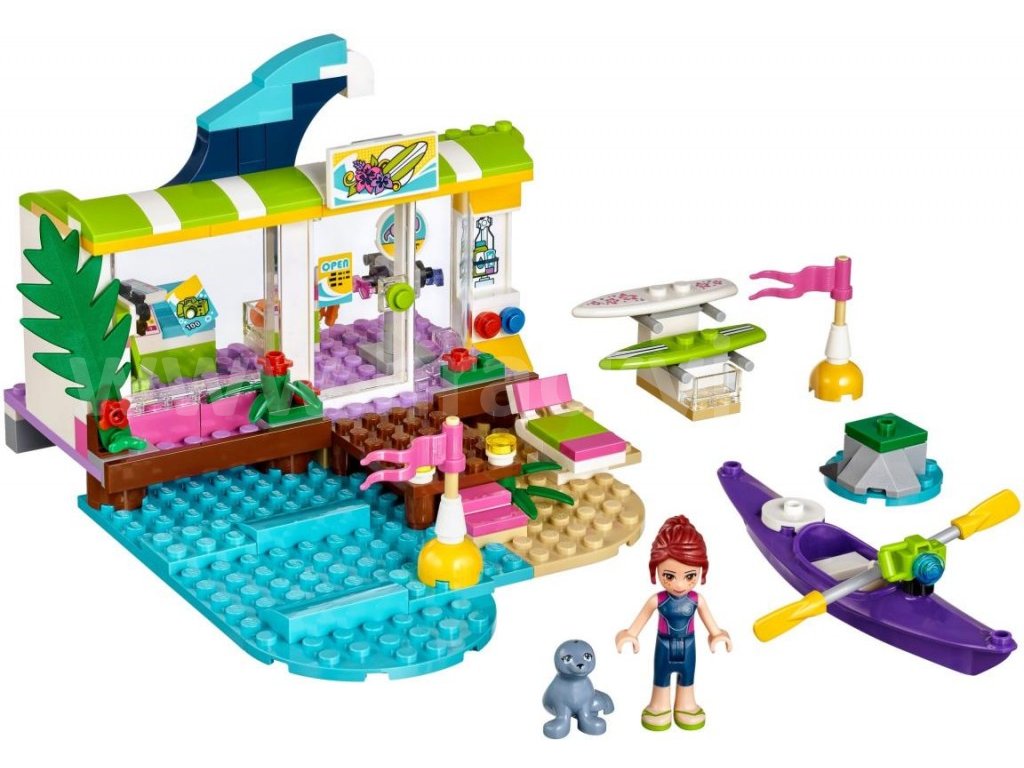 Sežeň všechny nutné prázdninové zásoby spolu s Miou v Surfařských potřebách v Heartlake! Nakup si spoustu pohlednic, sluneční brýle a vodu a půjč si všechny možné druhy vybavení pro vodní sporty. Můžeš si vybrat ploutve, surfovací prkna, kajak a pádlo a dokonce i podvodní kameru. Poté vyraz od mola Surfařských potřeb a prozkoumej celé pobřeží Heartlake. Všimneš si kamarádského lachtana? Po akčním odpoledni se ochlaď pod plážovou sprchou. Součástí je minifigurka-panenka Mia v neoprenovém obleku, navíc figurka tuleně Velveta.