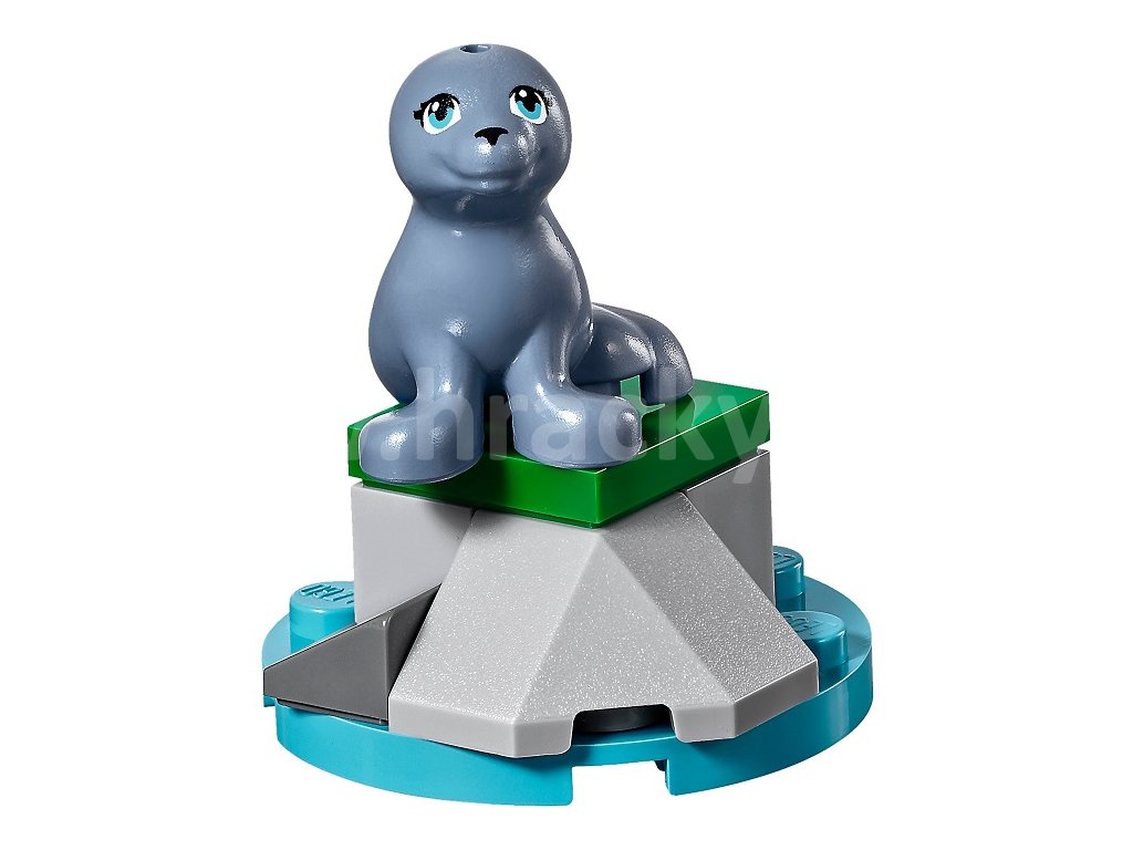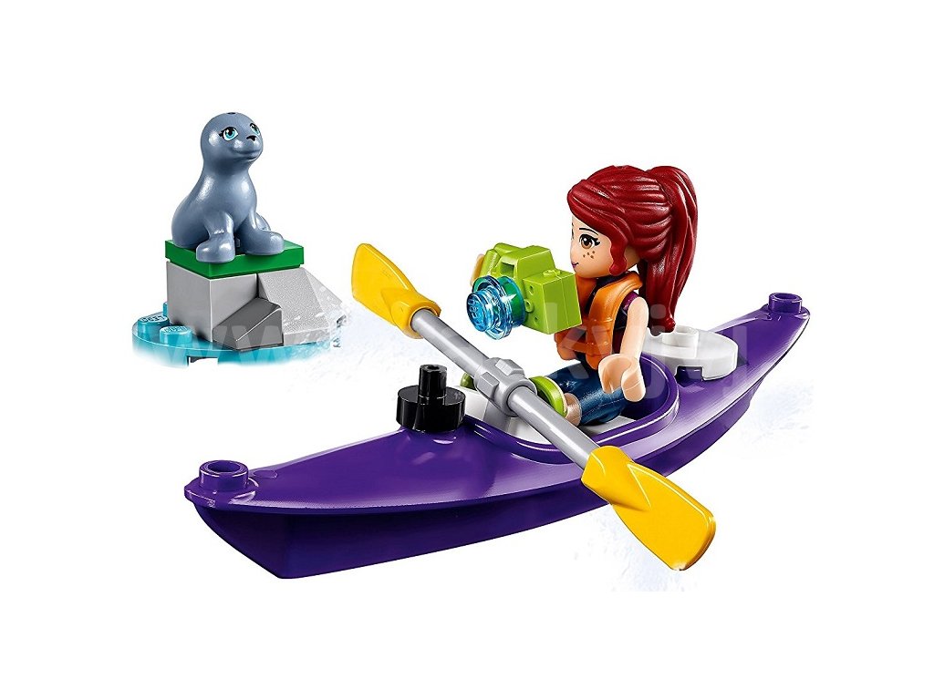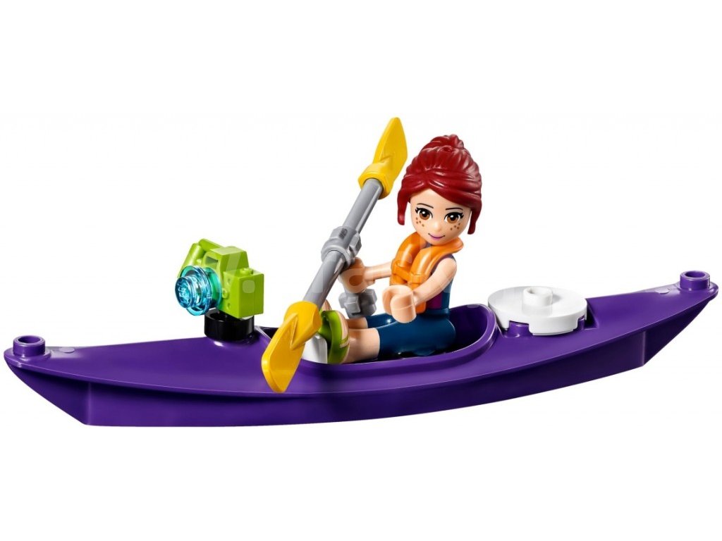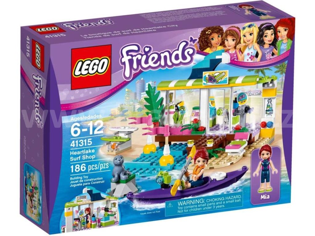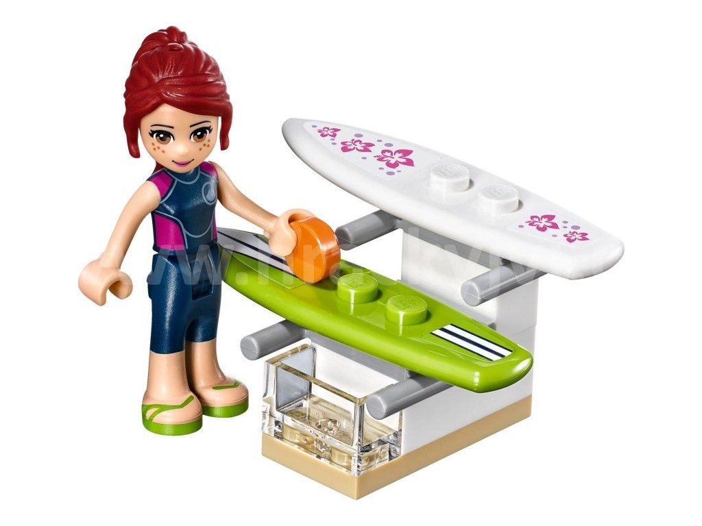 Sežeň všechny nutné prázdninové zásoby spolu s Miou v Surfařských potřebách v Heartlake! Nakup si spoustu pohlednic, sluneční brýle a vodu a půjč si všechny možné druhy vybavení pro vodní sporty. Můžeš si vybrat ploutve, surfovací prkna, kajak a pádlo a dokonce i podvodní kameru. Poté vyraz od mola Surfařských potřeb a prozkoumej celé pobřeží Heartlake. Všimneš si kamarádského lachtana? Po akčním odpoledni se ochlaď pod plážovou sprchou. Součástí je minifigurka-panenka Mia v neoprenovém obleku, navíc figurka tuleně Velveta.