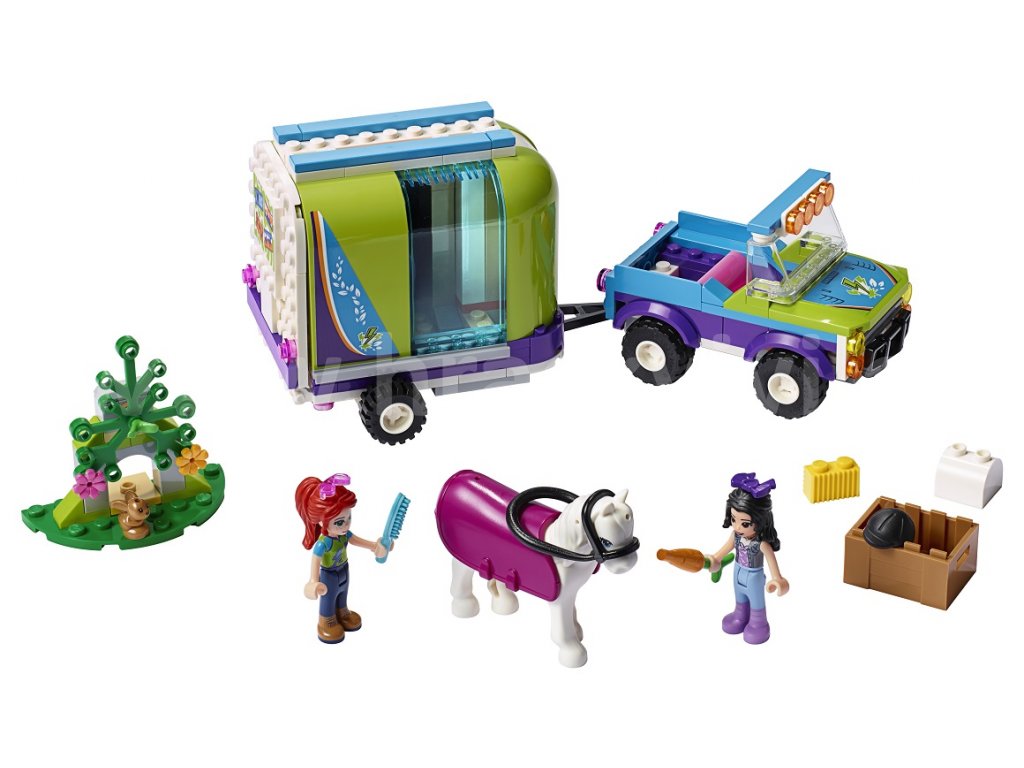 Nasedni na koně a vydej se prozkoumat les. Kamarádky LEGO® Friends Mia a Emma se rozhodly vyjet s Biancou na tréninkovou jízdu do lesa. Pomoz jim naložit přívěs vším, co budou pro koně potřebovat, pak ho připoj k Miině bezvadné bugině s pohonem 4x4 a můžeš vyrazit. V lese sundej z Biancy deku a osedlej ji, aby mohla Mia vyrazit na projížďku. Měj oči na stopkách a třeba uvidíš nějakého lesního živočicha. Co to bylo? Je to malý zajíček, který se na vás přišel podívat! Tato stavebnice pro všechny malé milovnice koní obsahuje 2 minipanenky: Miu a Emmu, a navíc figurky koně a králíka.
