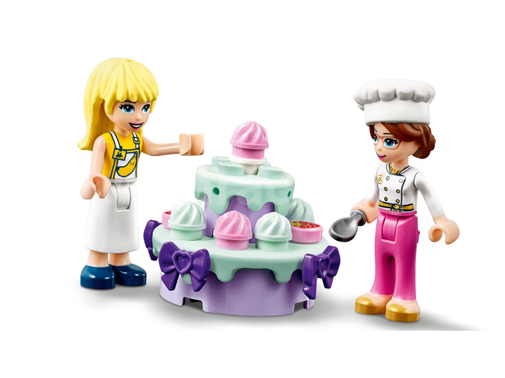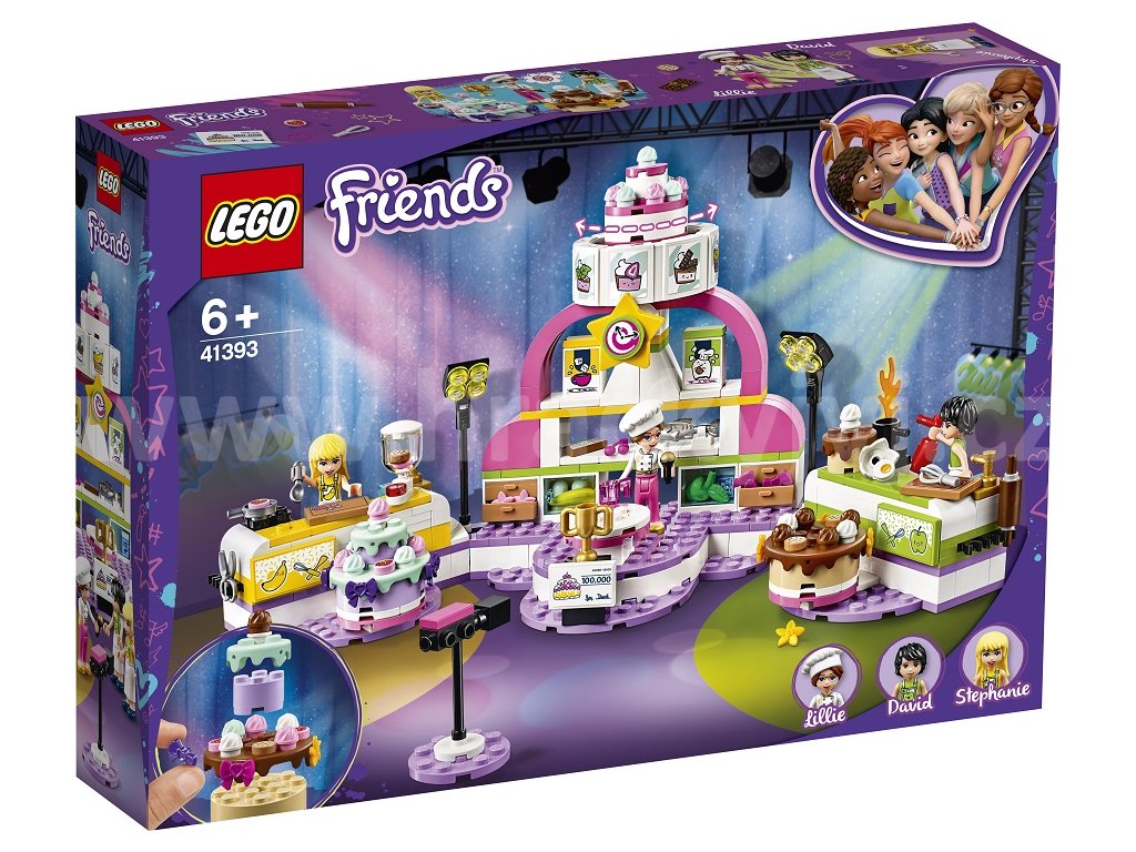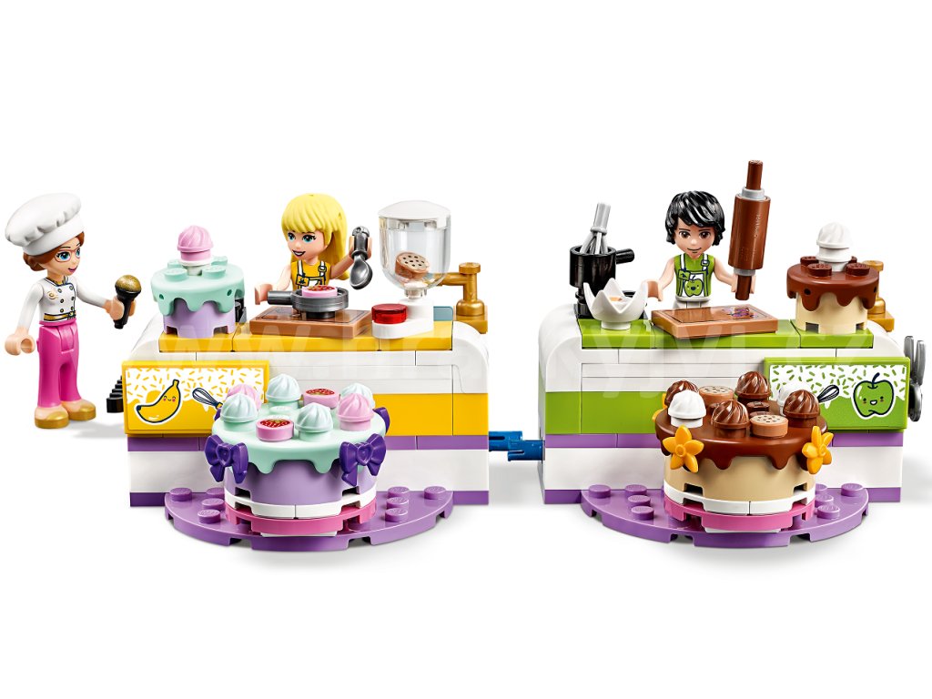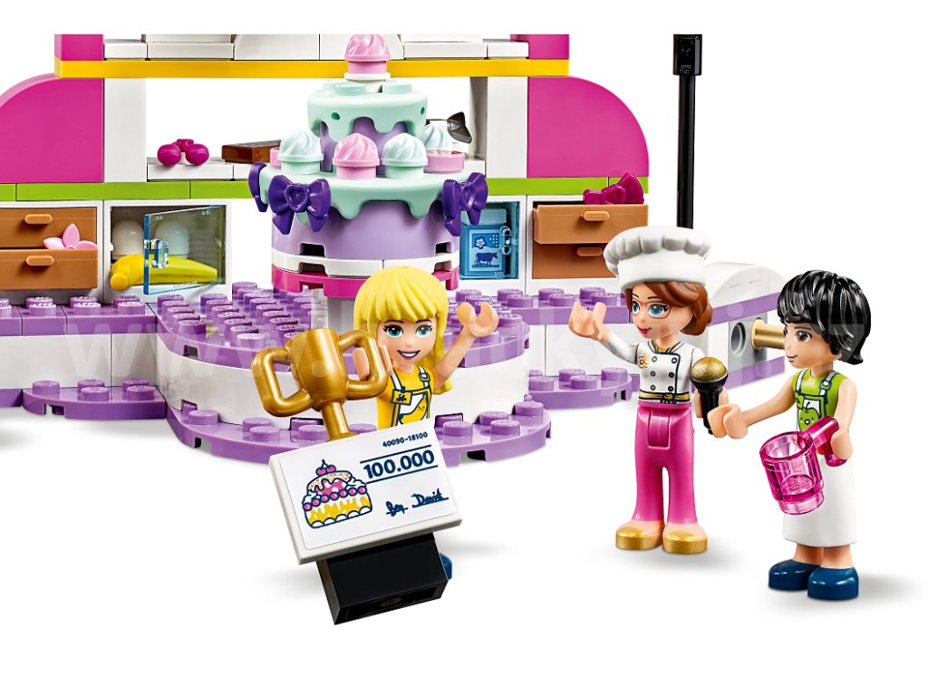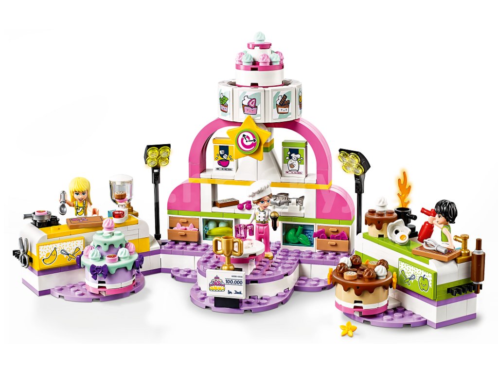 3, 2, 1… Pečeme! Připojte se k natáčení Stephaniiny soutěže v pečení v televizním studiu LEGO® Friends. Roztočte kolo nad pódiem a vylosujte tím některou z bláznivých ingrediencí, kterou musí pekaři při pečení použít. Popusťte uzdu své kreativitě při tvoření polevy a zdobení. Popadněte hasicí přístroj a pomozte Davidovi uhasit oheň. Čas neúprosně ubíhá, kdo zvítězí a odnese si trofej a finanční odměnu? Porotci potřebují vaši pomoc, aby se dokázali rozhodnout!