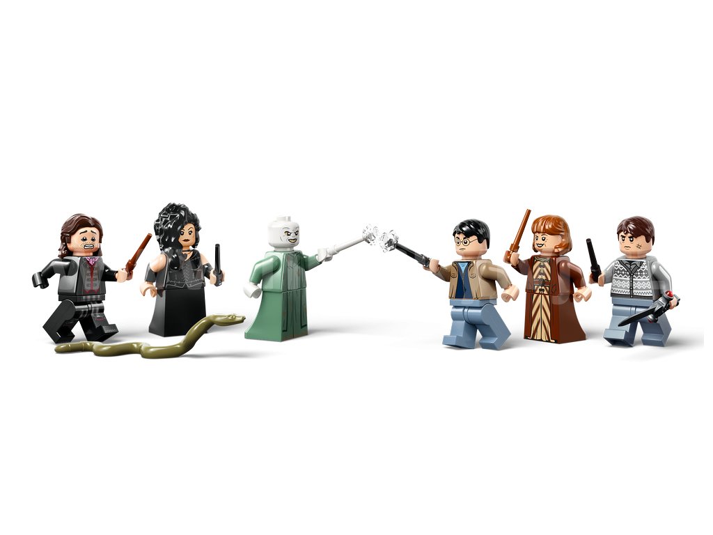 - 6 minifigurek LEGO® – Harry Potter™ a Voldemort™, každý s vlastní hůlkou a dílkem představujícím kouzlo, Neville Longbottom™ s Nebelvírovým mečem, Prašivec, Molly Weasleyová a Bellatrix Lestrangeová
