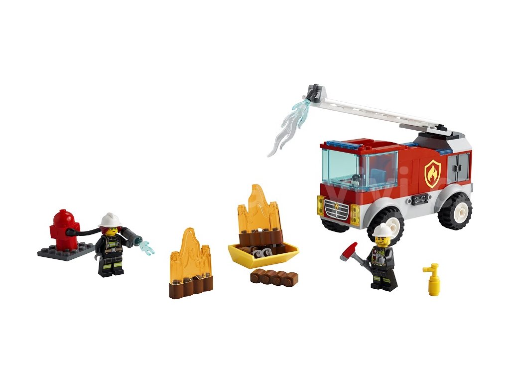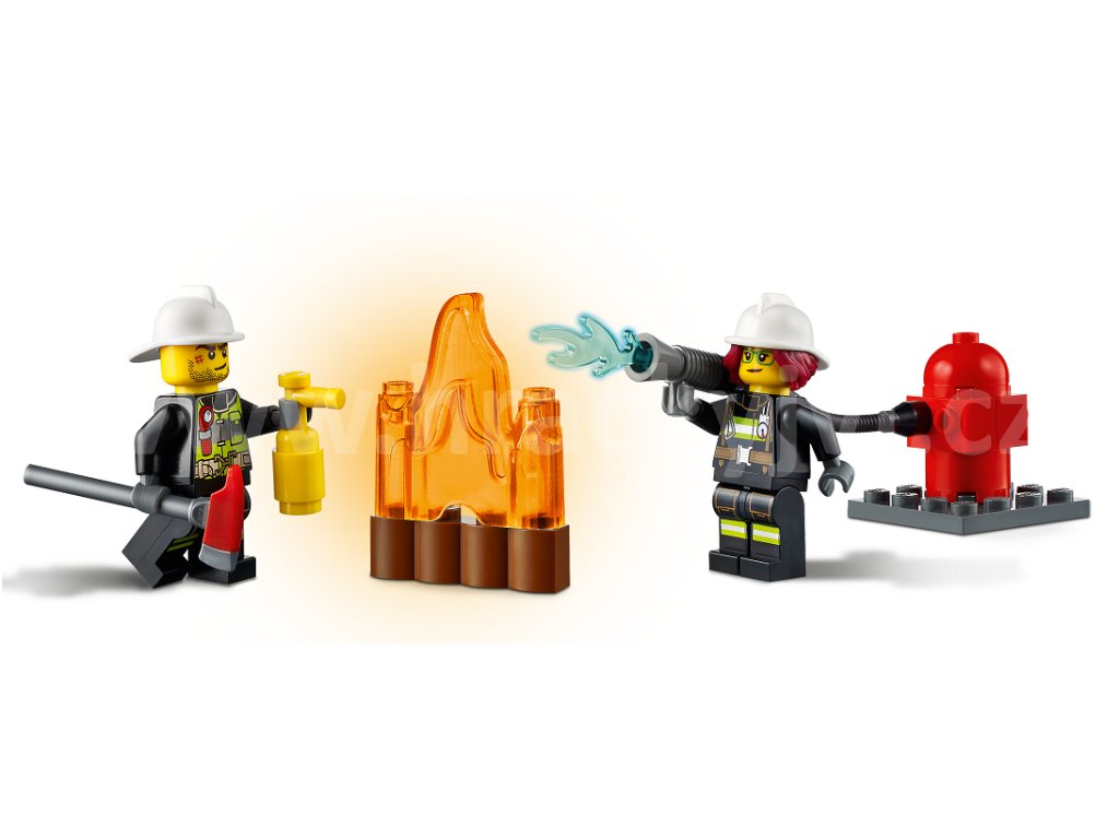- Co se ukrývá v krabici? Model hasičského vozu s žebříkem a hasicím přístrojem, vodní hydrant a stohovatelné LEGO® plameny, a k tomu navíc minifigurky hasiče a velitelky hasičů Freyi McCloudové z LEGO City TV.