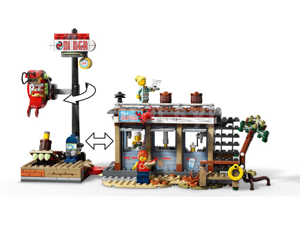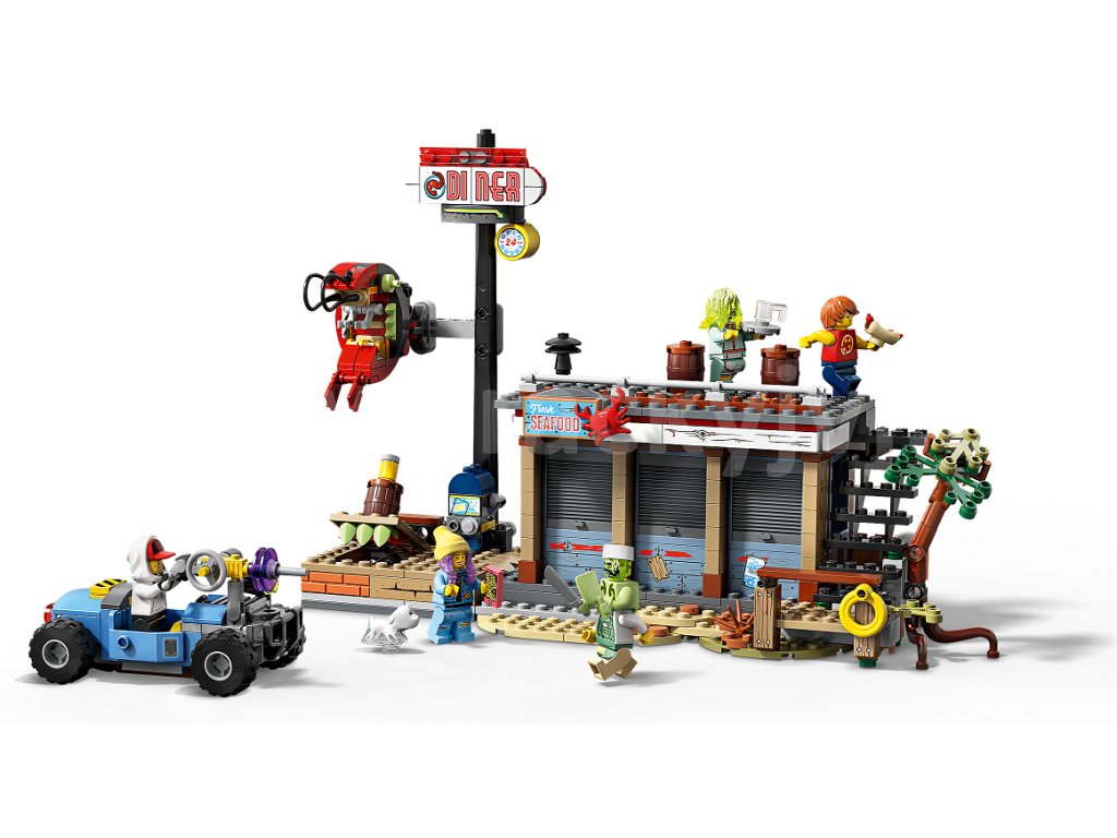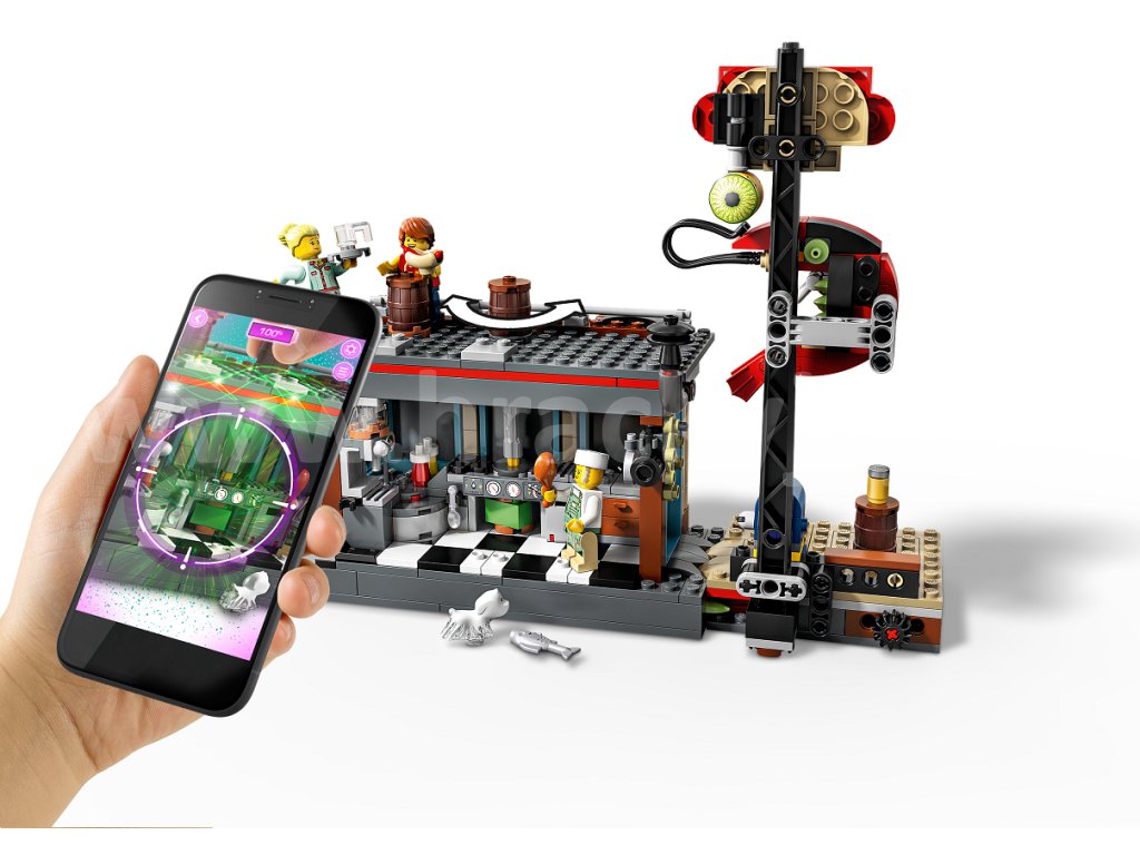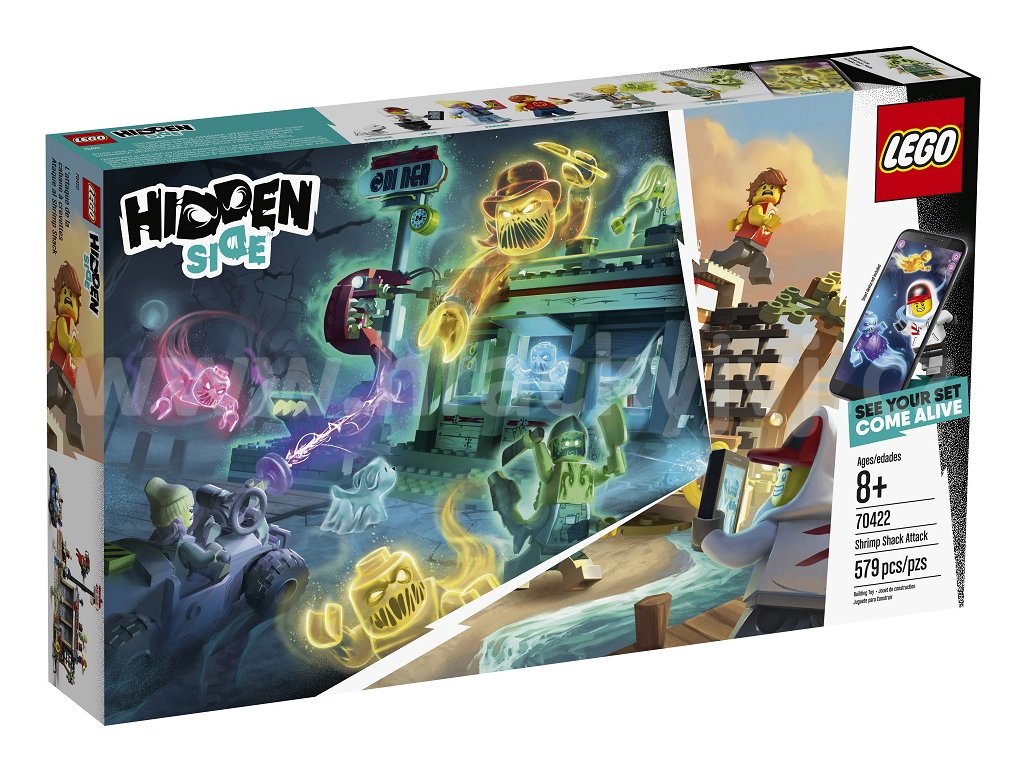 Odvážíš se vstoupit do světa Hidden Side? Stáhni si aplikaci LEGO® Hidden Side™, namiř telefon na stánek s krevetami a odhal svět duchů. Prozkoumej svět Hidden Side, řeš nové záhady, nacházej zajímavé předměty, chytej duchy a přidávej je do své sbírky, a nakonec poraz šéfa duchů – pokud si na to ovšem troufáš. Šéfkuchaře Enza a servírku Sally straší šéf duchů Anomalo a ve stánku s krevetami vyvádí velké neplechy. Přispěchej do akce s Parker Jacksonovou na její ultramoderní motokáře. Stavebnice je plná úžasných doplňků a najdeš v ní i ceduli restaurace s krevetami, kterou může posednout duch! Nebo si s touto úžasnou LEGO sadou přehrávej svá vlastní dobrodružství plná duchů! Tato sada využívající rozšířenou realitu obsahuje 6 figurek: Jacka Davidse se smartphonem a Parker L. Jacksonovou se smartphonem, šéfkuchaře Enza se dvěma noži, Sally s vozíkem a hrnkem, Ronnyho, a navíc Davidsova pejska ze záhrobí, Spencera.