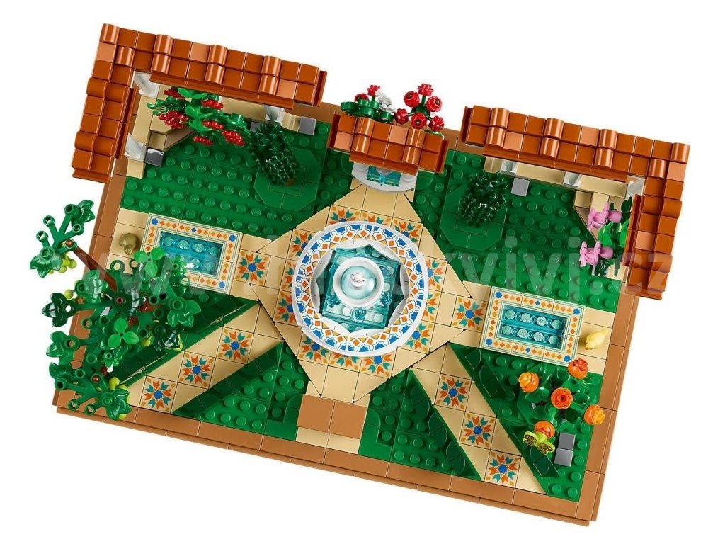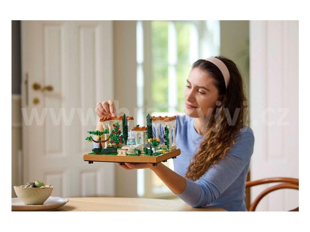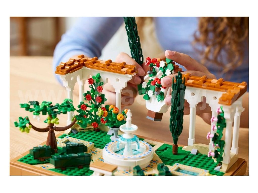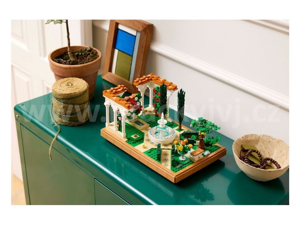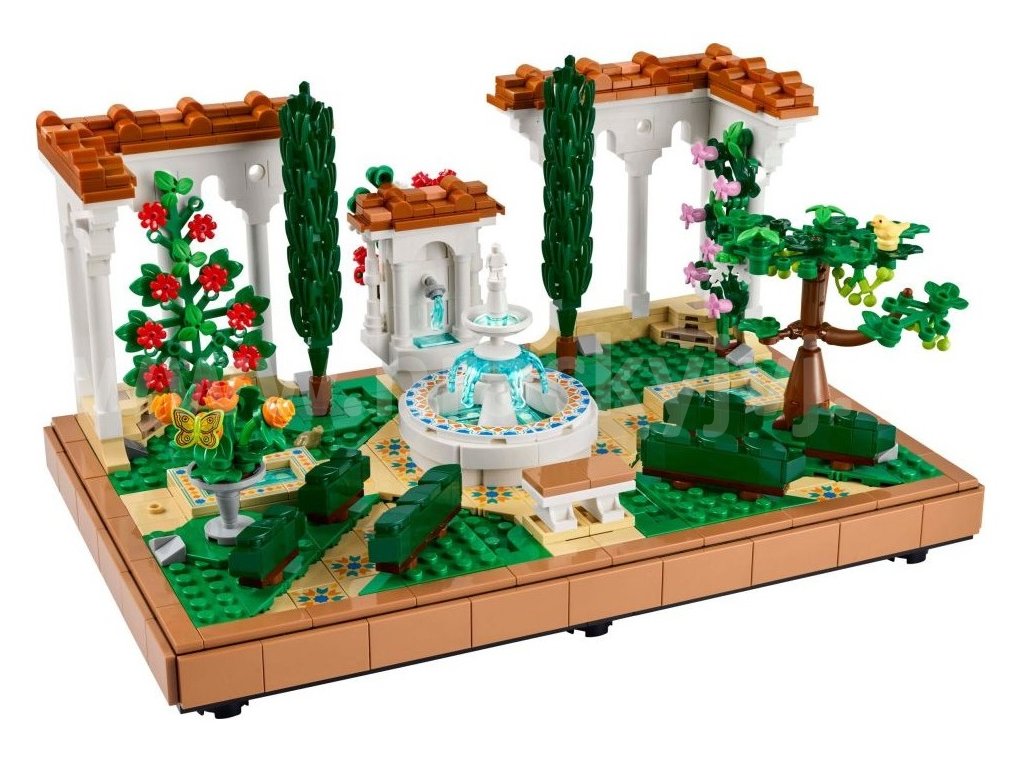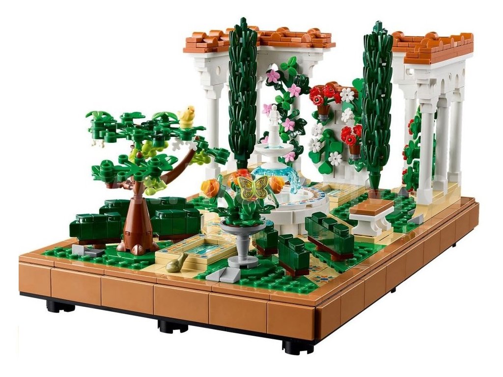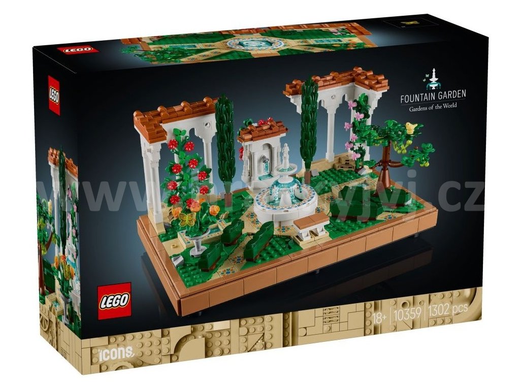 • Co najdete v krabici – LEGO® Zahrada s fontánou obsahuje stupňovitou fontánu, lavabo, 2 cypřiše, kvetoucí vinnou révu, 4 pergoly a dlážděné cestičky a figurku můry, ptáka a žáby