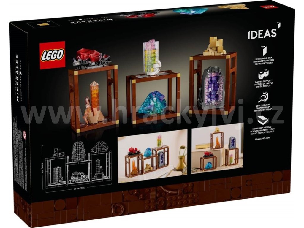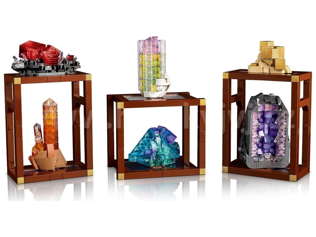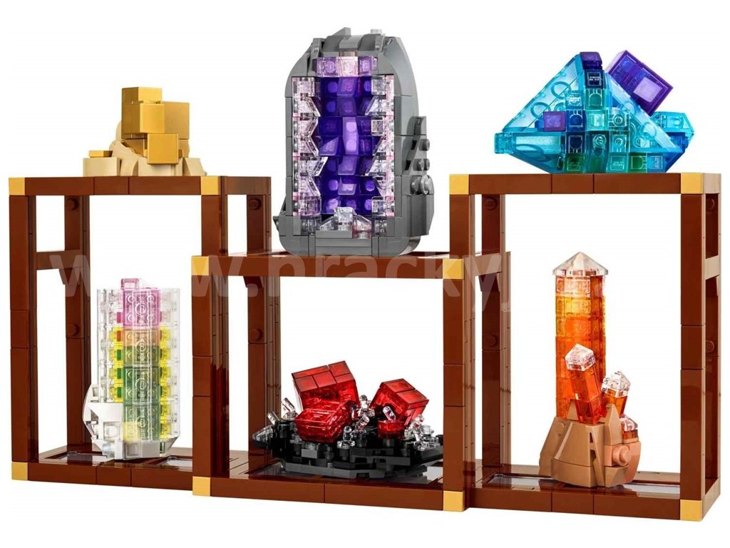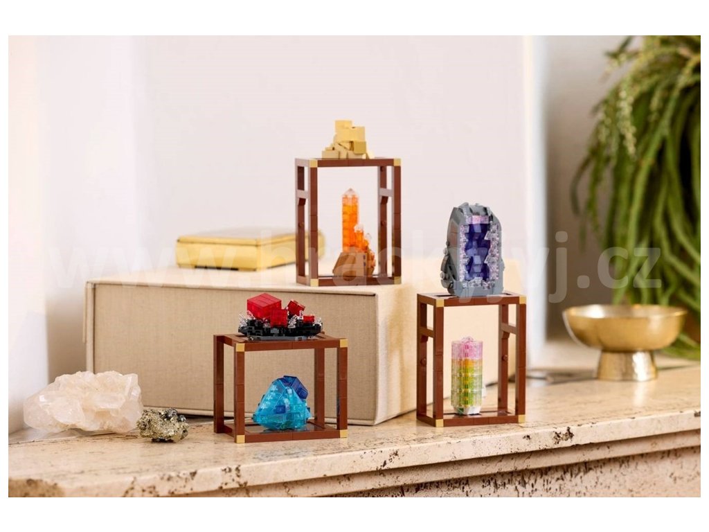 Pomocí chytrých stavitelských technik a průhledných kostek LEGO vytvořte model zlatého pyritu, fialového ametystu, modrého fluoritu, melounově zeleného turmalínu, červenorůžového rodochrozitu a oranžového křemene. Sestavte tři volně stojící police a umístěte na ně své výtvory, které pak můžete libovolně přestavovat. Návod na stavění tohoto modelu pro dospělé najdete v krabici – nebo si můžete užít intuitivní zážitek s aplikací LEGO Builder, ve které si můžete prohlížet digitální 3D verze modelů během stavění. Stavebnice se skládá z 880 dílků.