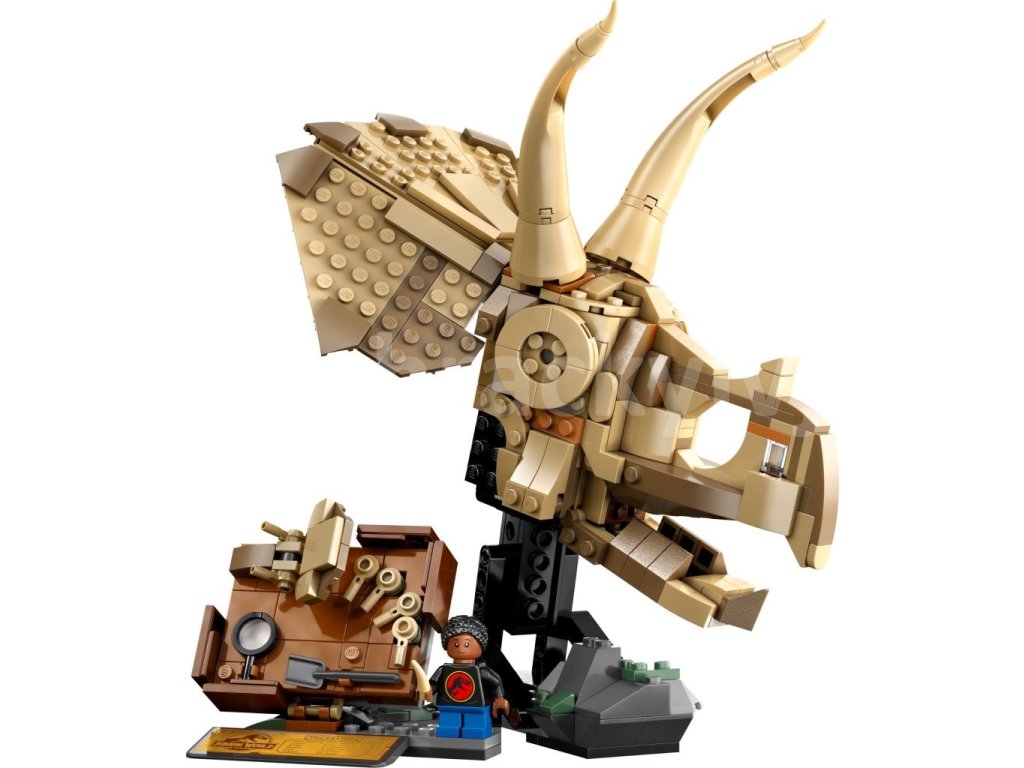 - Pohyblivá lebka triceratopse s otevírací čelistí – Lebku si vystavte v otevřené nebo zavřené pozici na stojanu, nebo vedle minifigurky, desky místa nálezu, minizkameněliny a nástrojů na vykopávání