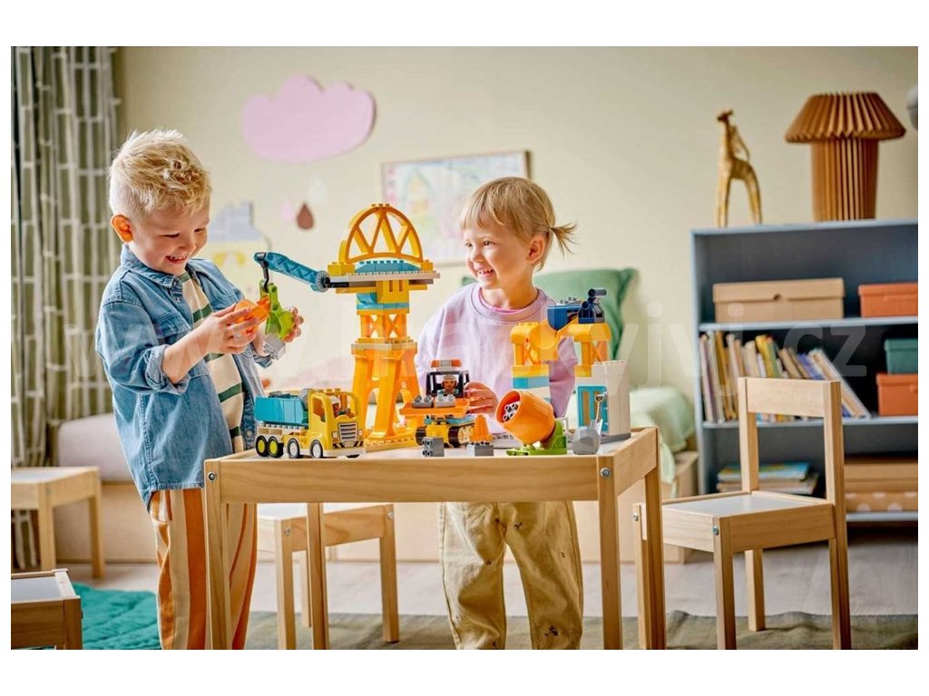 - ROZVÍJENÍ DOVEDNOSTÍ – Batolata si procvičí řešení problémů při vytváření staveniště, trpělivost při pokusech o zvedání kamenů jeřábem a prostorové vnímání přiježdění s vozidly pod mostem
