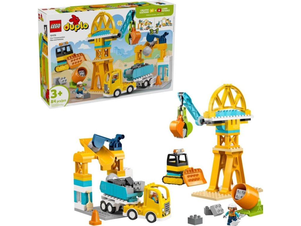 - VELKÁ STAVEBNICE PRO BATOLATA – Stavebnice Staveniště a vozidla 3 v 1 (10476) obsahuje 2 figurky a 84 kostek, ze kterých lze postavit spoustu nákladních aut LEGO® DUPLO® Město a dalších modelů