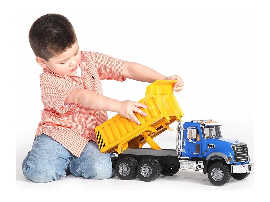Nákladní auto MACK by neměl chybět na žádné stavbě. Model amerického vozu MACK Granite s chromovými doplňky má sklápěcí přední kapotu s možností nahlédnutí na blok motoru, sklápěcí venkovní zrcátka, přední sklo vyrobené z vysoce odolného polykarbonátu, otevíratelné dveře. Nechybí ani zpětná zrcátka, nárazník, výfuk a světla na střeše. Sklápěcí korba je snadno ovladatelná pomocí hydrauliky a zadní stěnu je možné otevřít.