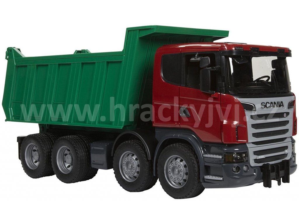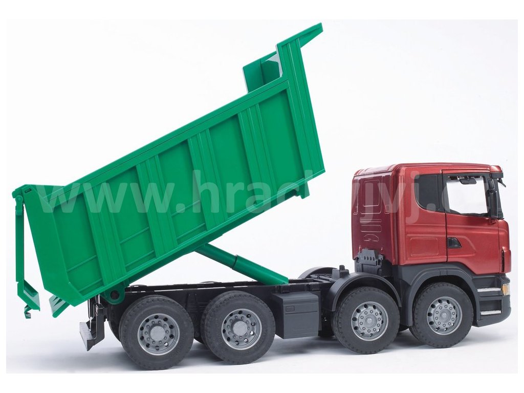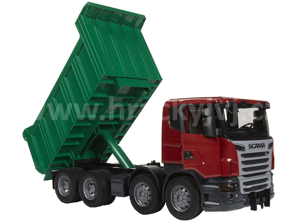 Bruder SCANIA LKW sklápěčka je mohutný čtyřnápravový sklápěč s robusními měkkými pneumatikami. Kabina řidiče je detailně propracována, samozřejmostí jsou sklopná zrcátka, otvíratelné dveře řidiče a čelní sklo vyrobené z kvalitního průhledného polykarbonátu. Obrovská vyklápěcí korba má zadní dveře, které lze otevřít při vykládce přepravovaného nákladu. Lze instalovat zvukový a světelný maják (2801) a čelní radlici (2582).