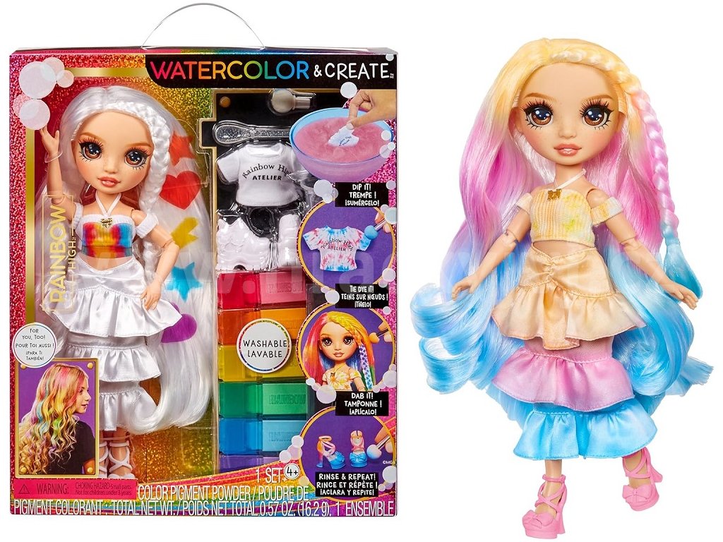 Udělejte si svou vlastní Rainbow High panenku! V balení najdeš panenku s bílými vlasy oblečenou od hlavy k patě do bílé barvy a 6 smývatelných duhových prášků (červený, oranžový, žlutý, zelený, modrý a fialový), gumičky k batikování a aplikační houbičku. Existuje nekonečně mnoho způsobů, jak vybarvit oblečení panenky nebo její vlasy. Po dokončení můžeš panenku opláchnout a vybarvit ji úplně jinak. Prášek nasypeš do vody. Do barevné vody můžeš namočit vlasy a oblečení, nebo houbičku, kterou budeš vytvářet vzory. Pomocí gumiček svaž oblečení a vytvářej různě batikovaný outfit. Balení obsahuje panenku s hnědýma očima a pohyblivými klouby, bílý outfit, barevné prášky a další doplňky k barvení oblečení a vlasů.