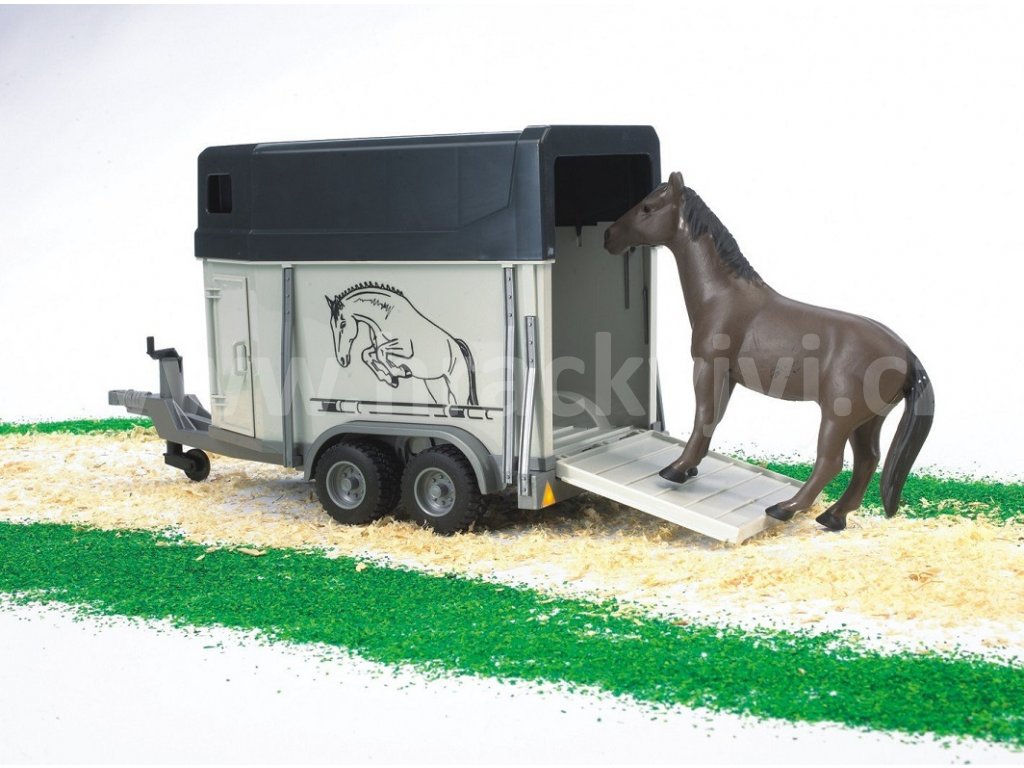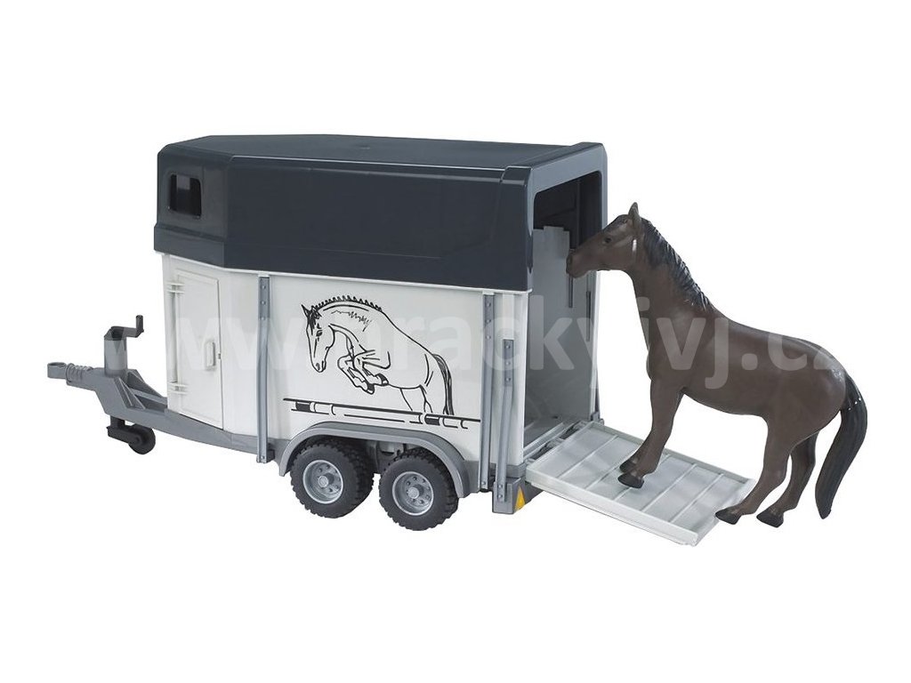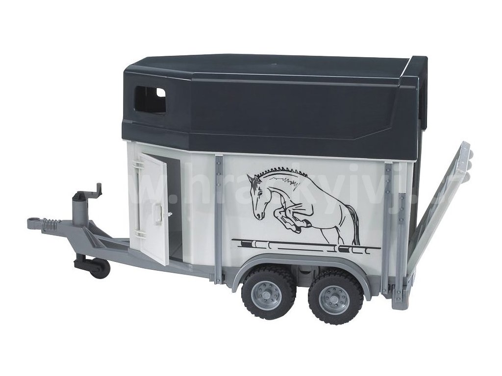Přívěs pro přepravu koní + 1 kůň navíc je určen pro pohodlnou a bezpečnou přepravu koní. Je vybaven zadní sklápěcí rampou a boční dveře lze otevřít. Přívěs má opěrnou nohu pro větší stabilitu, která se ovládá pomocí ruční kličky. Přepravník lze připojit ke všem traktorům a strojům BRUDER serie 20xx, 21xx, 30xx, Jeep Wrangler a MB Sprinter.