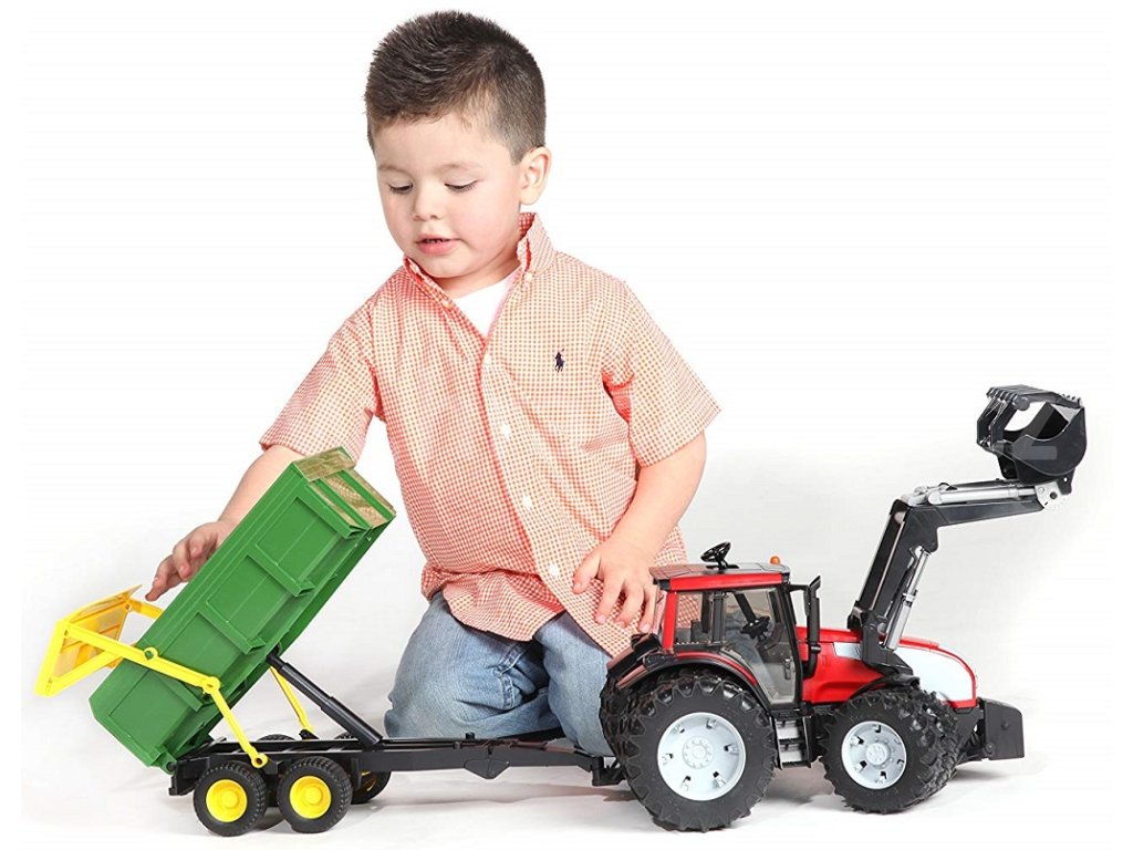 BRUDER 2210 Přívěs s automatickou zadní stěnou lze připojit ke všem traktorům a strojům BRUDER Profi série. Přívěs je vybaven vysokosklopnou korbou, jejíž zadní stěna se automaticky otevírá. Stabilitu přívěsu zajišťuje sklopná opěrná noha a pro jízdu i v náročnějším terénu je přívěs vybaven profilovými pneumatikami.