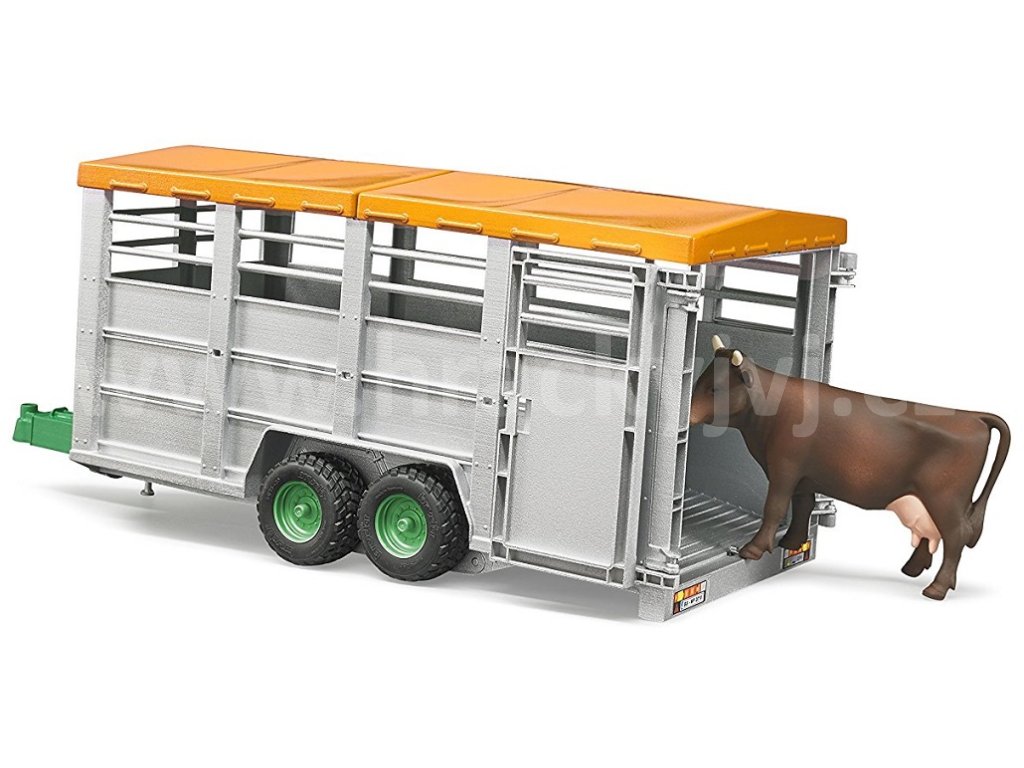 BRUDER 2227 Přívěs na hospodářská zvířata s figurkou krávy je velmi kvalitně a detailně propracovaný přívěs, jehož součástí je figurka krávy. Přepravník má profilové pneumatiky a odnímatelnou dvoudílnou střechu. Pro dokonalou stabilitu je vybaven sklápěcí opěrnou nohou. K přívěsu lze samostatně dokoupit další figurky zvířátek (br 2308, br 2306) či figurky Bworld, které rozšíří funkčnost přívěsu a dětem rozvíjí jejich kreativitu.