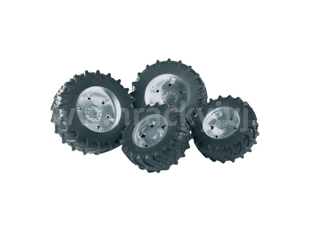 Přídavná kola na traktory série 30xx. Stříbrné disky jsou vyrobeny z ABS plastu, pláště z gumy. Zadní pneumatiky mají průměr 12,5 cm a přední 9,8 cm.