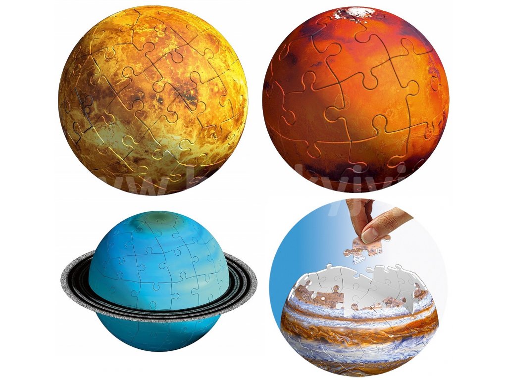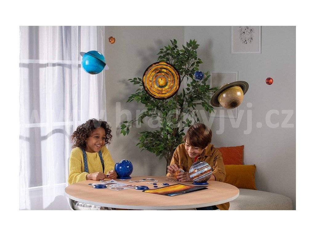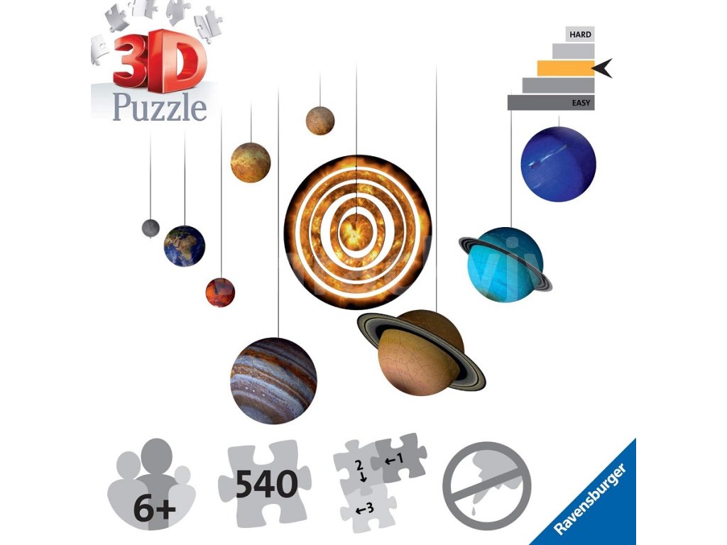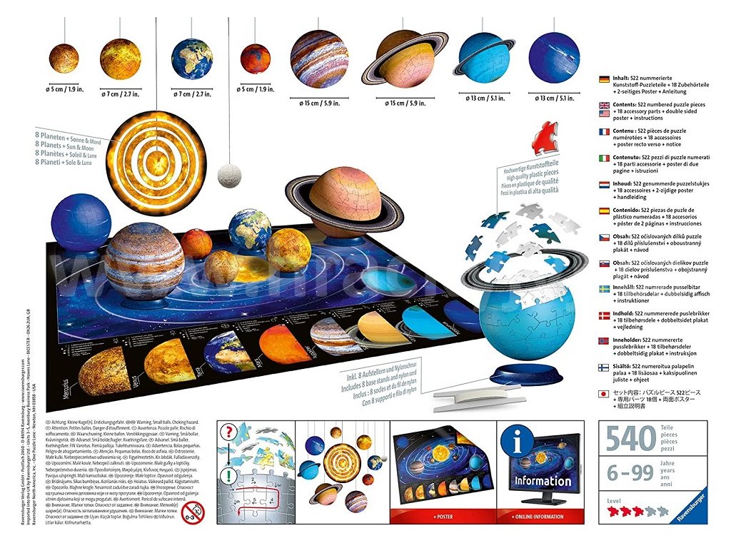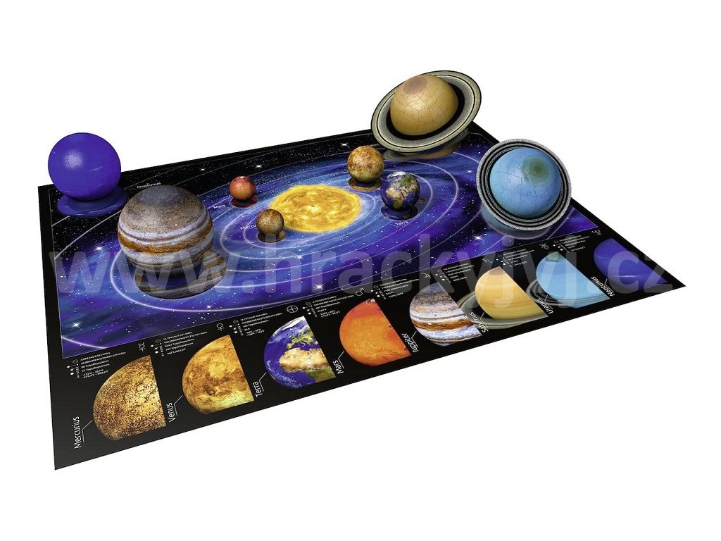 Postavte si 3D stabilní planetární soustavu. Speciální zakřivené nebo ohebné dílky, které přesně zapadnou na své místo, umožňují postavit tyto modely. Dílky jsou vyrobeny z pevného plastu, zaručí tak vynikající stabilitu a celý model drží bez nutnosti lepení. Balení obsahuje 522 očíslovaných dílků puzzle, 18 dílů příslušenství, oboustranný plakát a návod.