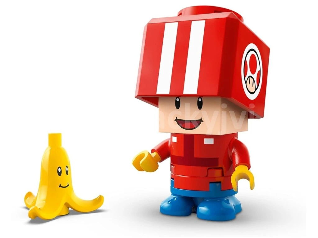 - Figurka Toad (Pit Crew) – Tento dobrodružný set Mario Kart™ z kostek LEGO® obsahuje figurku Toada (Pit Crew) v červené uniformě posádky a Banana s obličejem