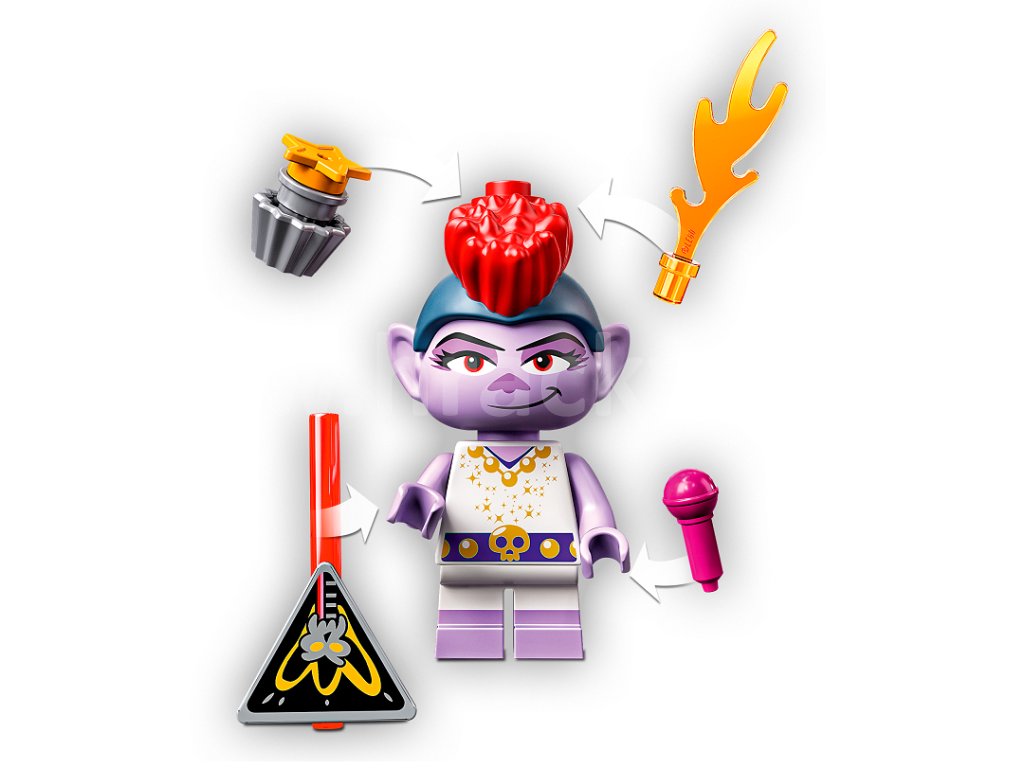 Rocková bitva může začít! Nenechte si ujít souboj Poppy a rockové královny Bárbry v sadě Trollové a rockový koncert. Pomozte jim vyzkoušet si různé doplňky před zrcadlem – Větvík ve svých vlasech dokonce může skrývat věci! Prohlédněte si úžasná, pohyblivá křídla pódia. Poté zhlédněte vystoupení trollů na otočných pódiích s kytarou a mikrofonem. Díky 3 minifigurkám, včetně exkluzivní minifigurky Bárbry, si děti mohou hrát s trolly a zkoumat řadu funkcí v této sadě, která je ideální pro milovníky kreativního hraní. Právě díky těmto drobným detailům je tato sada natolik zábavná! Poppy a Větvík mají exkluzivní rockové outfity. Dále jsou k dispozici trolí vlasové doplňky a dvě sběratelské hudební struny, které patří do lyry.